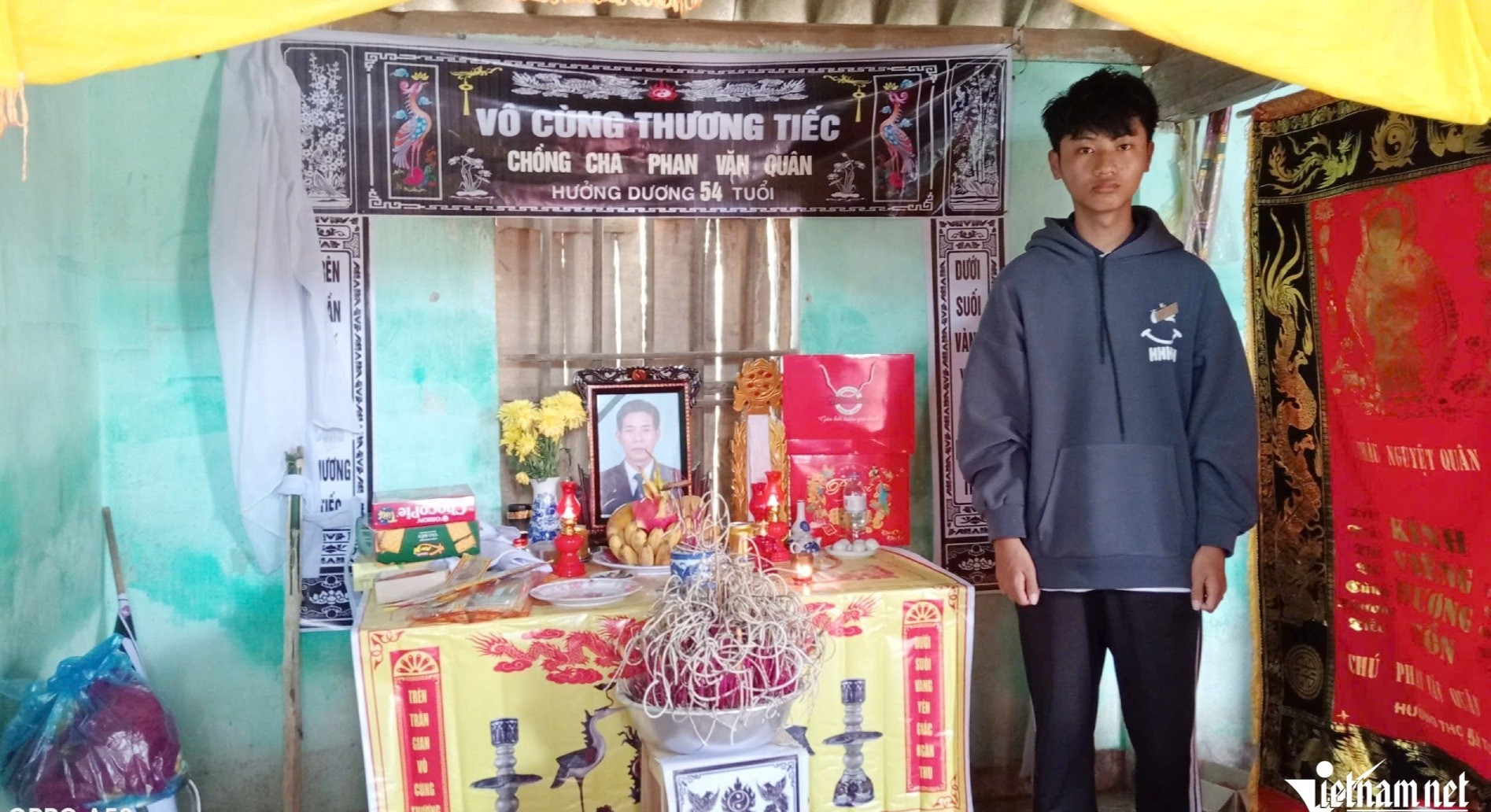 Cậu bé Phan Văn Nam thất thần bên di ảnh cha. Ảnh: Sỹ Thông