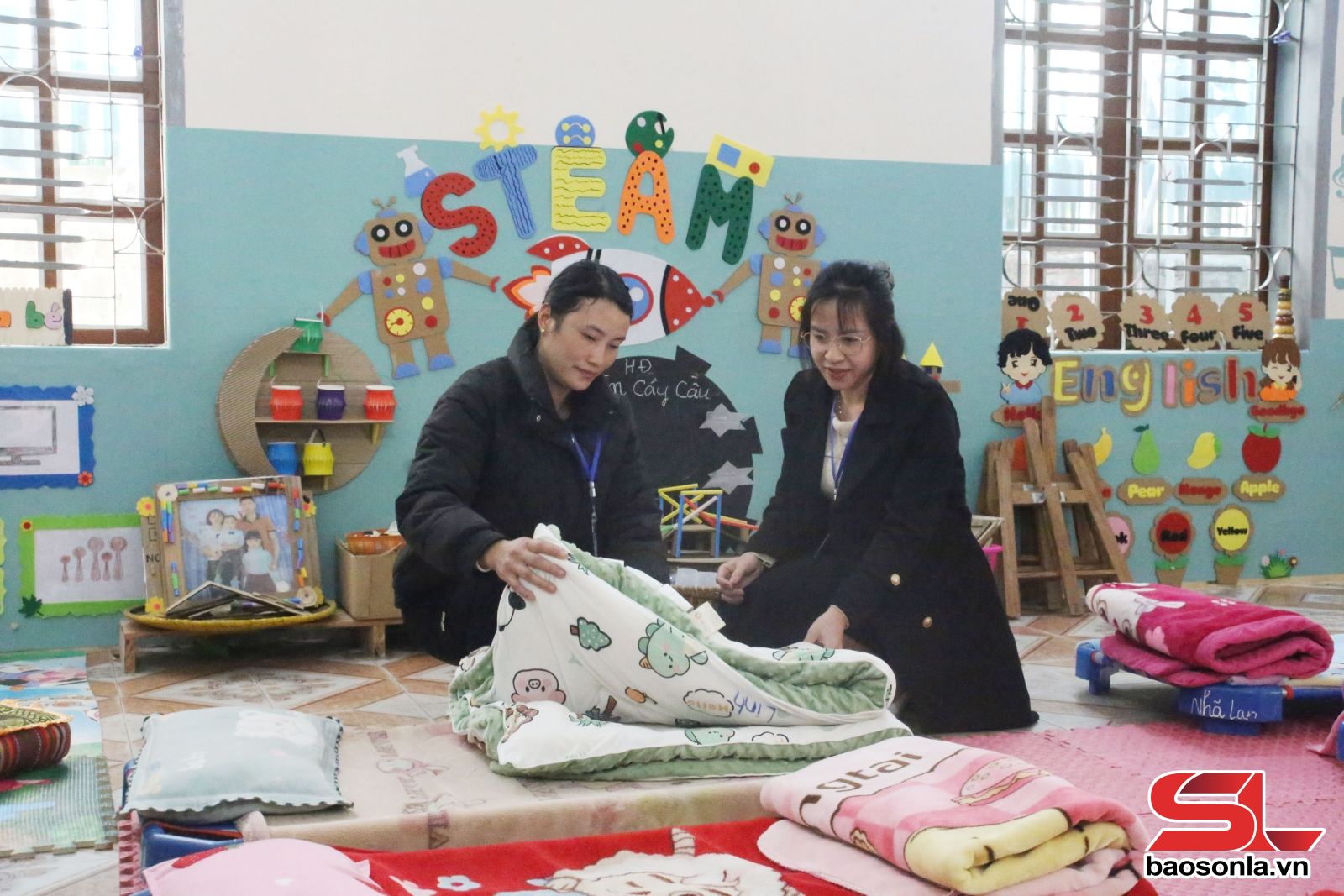 Giáo viên Trường Mầm non Họa Mi chuẩn bị chỗ ngủ cho học sinh.