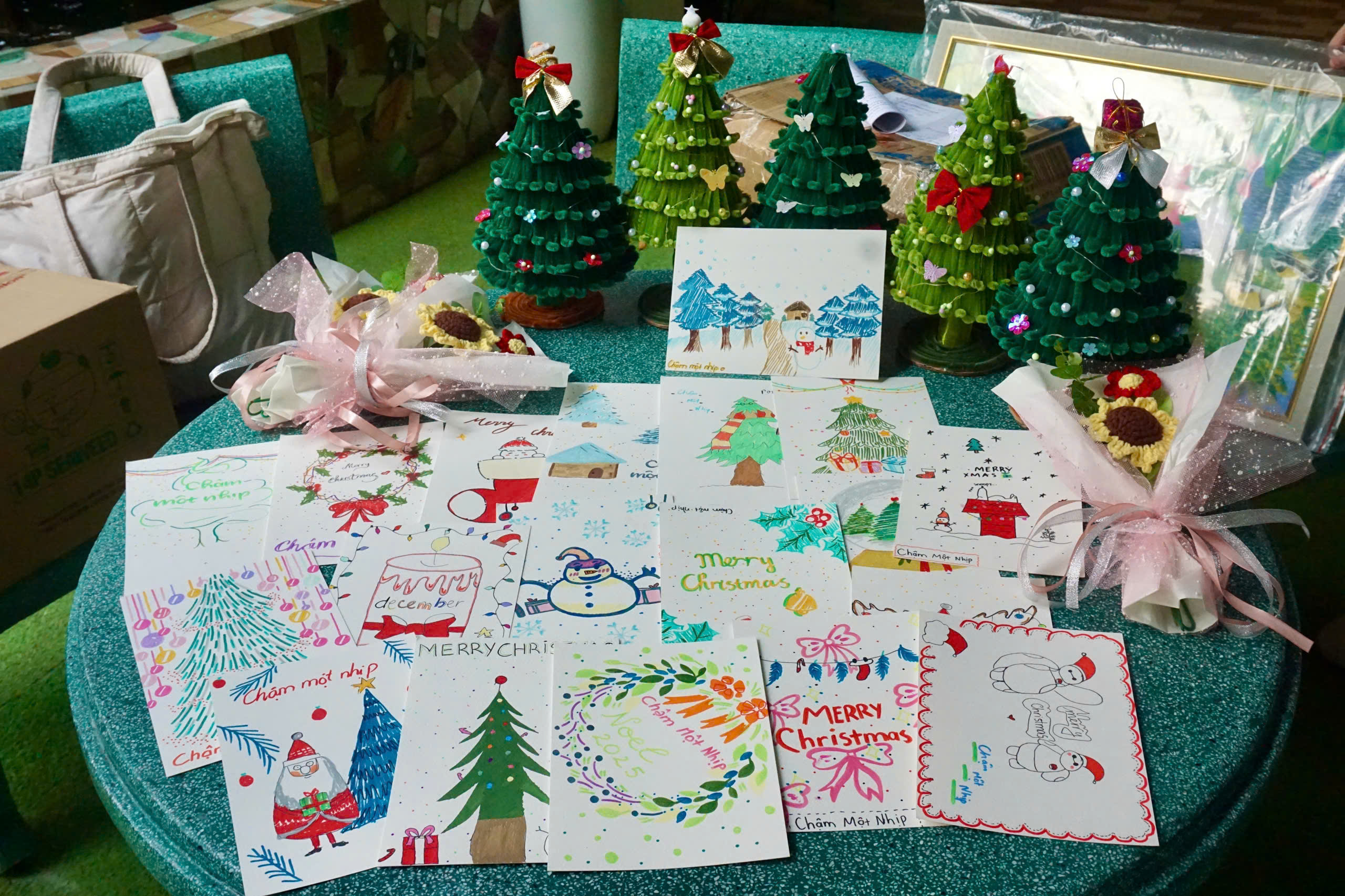 Đó là những cây thông được làm bởi các em nhỏ đang chiến đấu với ung thư, là những bức tranh sắc màu tự tay các tình nguyện viên vẽ nên... Tất cả những điều đó được Câu lạc bộ thiện nguyện "Chậm một nhịp" hội tụ lại để làm nên một buổi sinh hoạt vui vẻ và ấm áp cho những cụ ông, cụ bà.