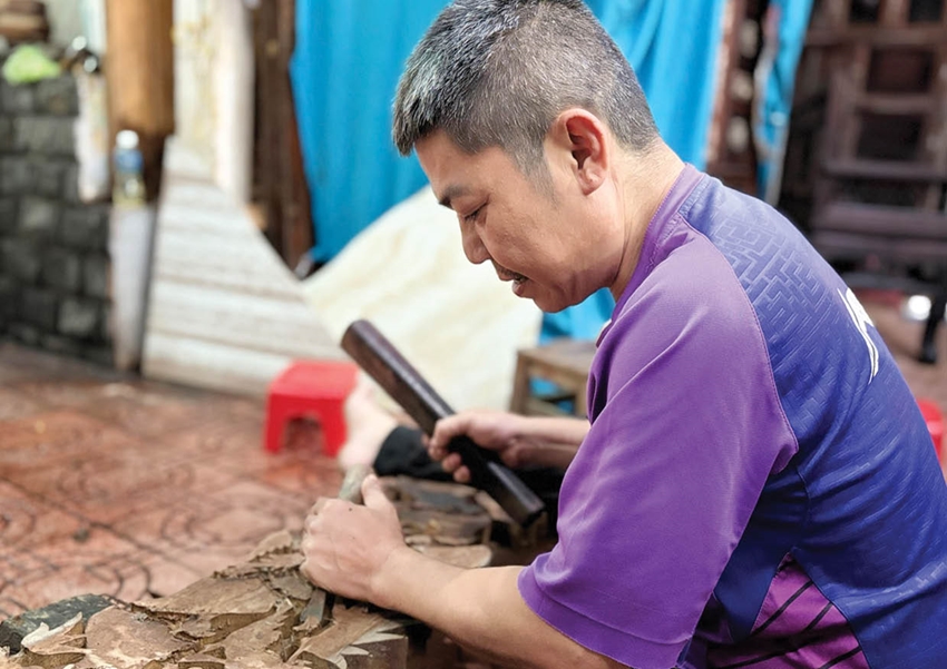 Đến với nghề từ năm 1990, khi còn là cậu thanh niên chưa tròn 16 tuổi, đến nay, anh đã trải qua 35 năm miệt mài sống cùng tiếng đục, tiếng bào. Anh cho biết, nguyên liệu anh thường chọn để chế tác thường là gỗ gõ. Loại gỗ này bền chắc, ít mối mọt, ít cong vênh, vân gỗ đẹp và thớ mịn, phù hợp cho việc chạm trổ tinh xảo.