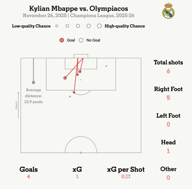 Tại Hy Lạp, Kylian Mbappe một lần nữa chứng minh đẳng cấp của mình khi một tay mang về chiến thắng 4-3 cho Real Madrid trước Olympiacos. Ngôi sao người Pháp đã ghi cả 4 bàn thắng cho đội bóng hoàng gia. Đáng chú ý, sự sắc bén của Mbappe được thể hiện rõ khi anh ghi 4 bàn với chỉ số bàn thắng kỳ vọng (xG) tích lũy chỉ là 1.0. Màn trình diễn này đã giúp Real Madrid tăng cơ hội vào thẳng vòng 16 đội từ 60% lên 85%.