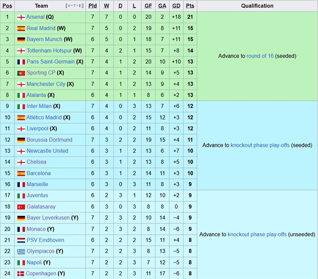Bảng xếp hạng 24 đội bóng dẫn đầu ở vòng League Phase.