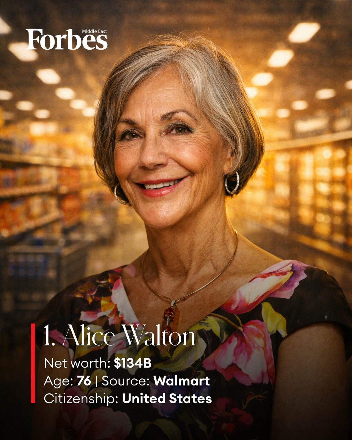 Bà Alice Walton - Người thừa kế tập đoàn Walmart (Mỹ) đã nới rộng khoảng cách dẫn đầu trong bảng xếp hạng tỷ phú thế giới hàng năm của Forbes năm 2026. Tài sản của bà đã tăng thêm 33 tỷ USD trong 12 tháng qua, lên 134 tỷ USD khi cổ phiếu của gã khổng lồ bán lẻ này tăng 30%. Nhờ kết quả kinh doanh mạnh và doanh số thương mại điện tử toàn cầu tăng, Walmart cũng trở thành hãng bán lẻ truyền thống đầu tiên đạt vốn hóa 1.000 tỷ USD hồi tháng 2.