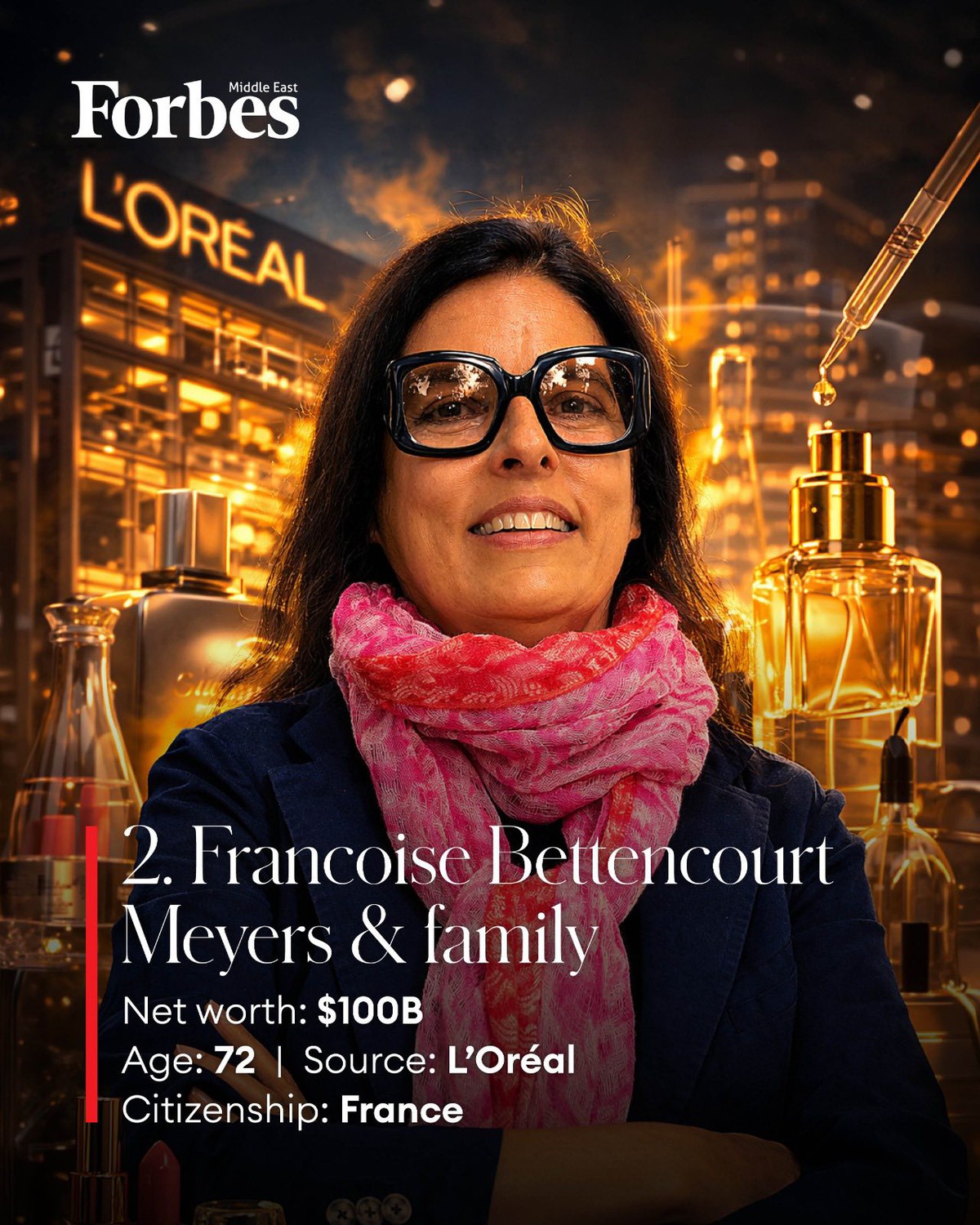 Nữ thừa kế L'Oreal người Pháp Françoise Bettencourt Meyers (72 tuổi) có thêm 18,4 tỷ USD trong năm qua khi cổ phiếu tập đoàn mỹ phẩm tăng 13%. Bà hiện sở hữu 100 tỷ USD. Bà rời hội đồng quản trị tập đoàn này năm ngoái, khép lại 28 năm gắn bó. Trước đó, bà cũng từng giữ chức phó chủ tịch L'Oreál. Vị trí này hiện do con trai bà - Jean-Victor Meyers đảm nhiệm.