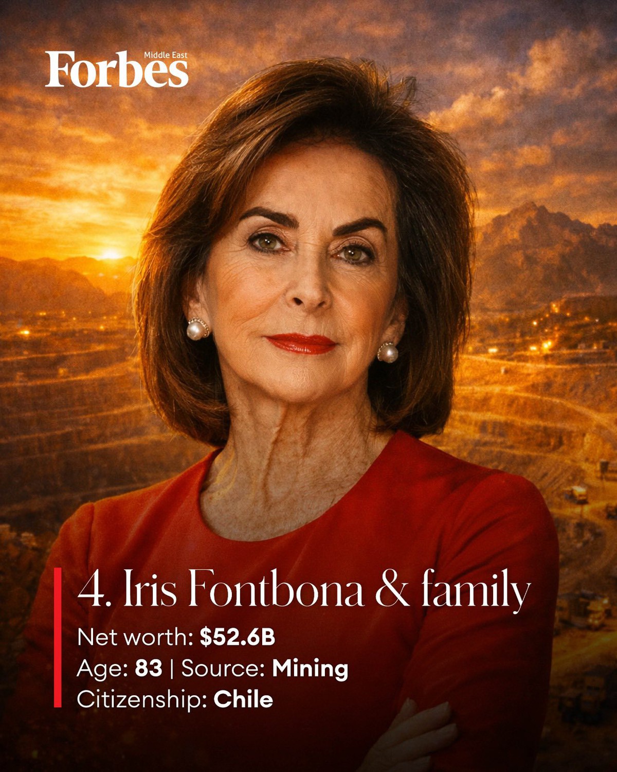 Iris Fontbona (83 tuổi) hiện là người giàu nhất Chile. Phần lớn tài sản của bà đến từ Antofagasta - công ty khai thác đồng mà bà thừa kế từ người chồng quá cố Andrónico Luksic. Bà là một trong những người tăng tài sản mạnh nhất trong top 10, với 24,5 tỷ USD trong năm qua, nhờ giá đồng thế giới lên cao kỷ lục. Tài sản của bà hiện là 52,6 tỷ USD.