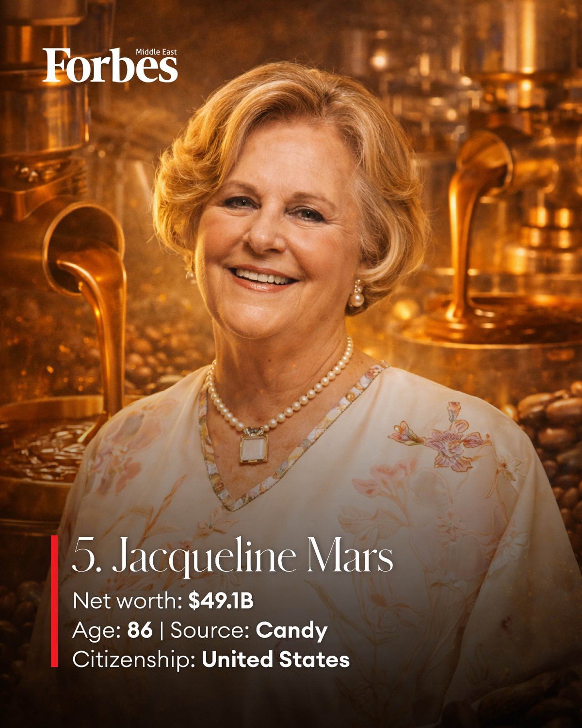 Bà là thế hệ thứ 3 thừa kế đế chế bánh kẹo Mars. Công ty Mỹ này nổi tiếng với các sản phẩm như M&M's, Pringles và Combos. Mars cũng là một trong những doanh nghiệp lớn trong lĩnh vực chăm sóc thú cưng. Jacqueline Mars làm việc tại tập đoàn gần 20 năm, đồng thời giữ vị trí trong hội đồng quản trị đến năm 2016. Năm nay, tài sản của bà tăng 6,5 tỷ USD, đưa tổng tài sản lên 49,1 tỷ USD.