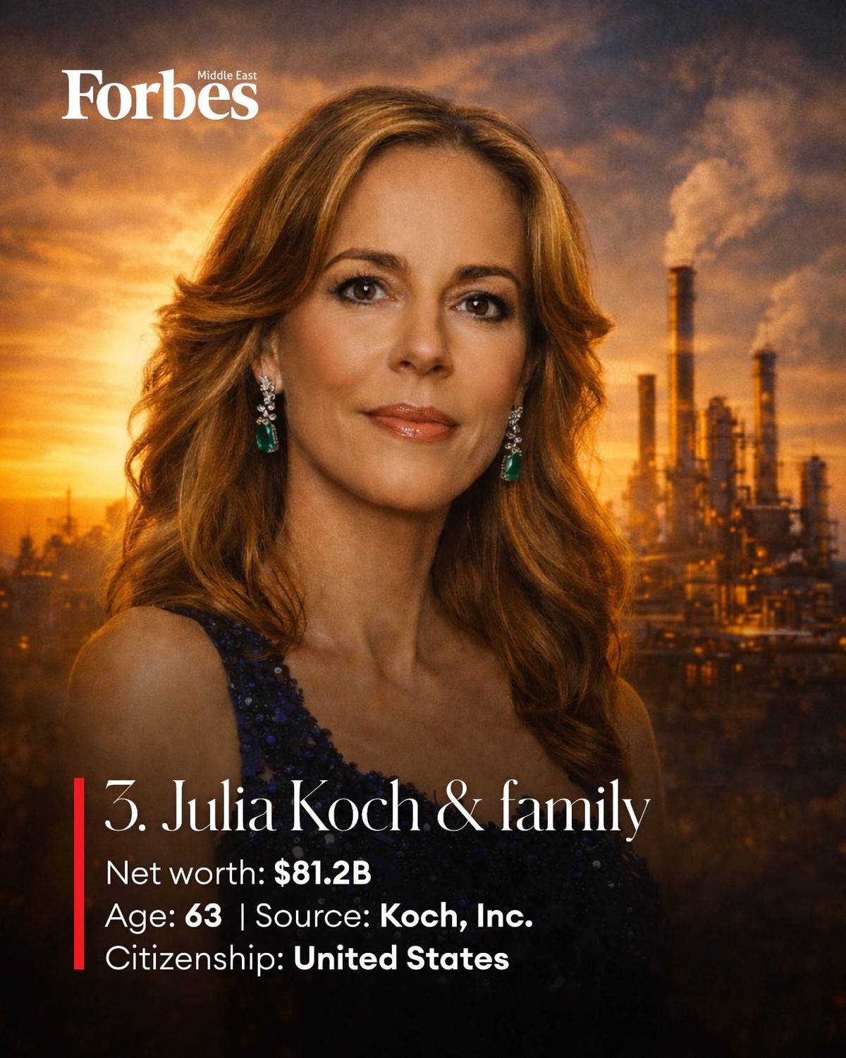 Julia Koch (63 tuổi) là vợ cố tỷ phú David Koch có tài sản 81,2 tỷ USD. Sau khi chồng qua đời năm 2019, bà cùng các con thừa hưởng khoảng 42% cổ phần của Koch Inc., một trong những doanh nghiệp tư nhân lớn nhất nước Mỹ. Gần đây, gia đình Koch còn mở rộng đầu tư sang lĩnh vực thể thao khi mua 10% cổ phần đội bóng NFL New York Giants khoảng 10 tỷ USD. Hơn một năm trước đó, gia đình Koch cũng chi gần 700 triệu USD để mua 15% BSE Global, công ty sở hữu đội bóng rổ Brooklyn Nets và New York Liberty.