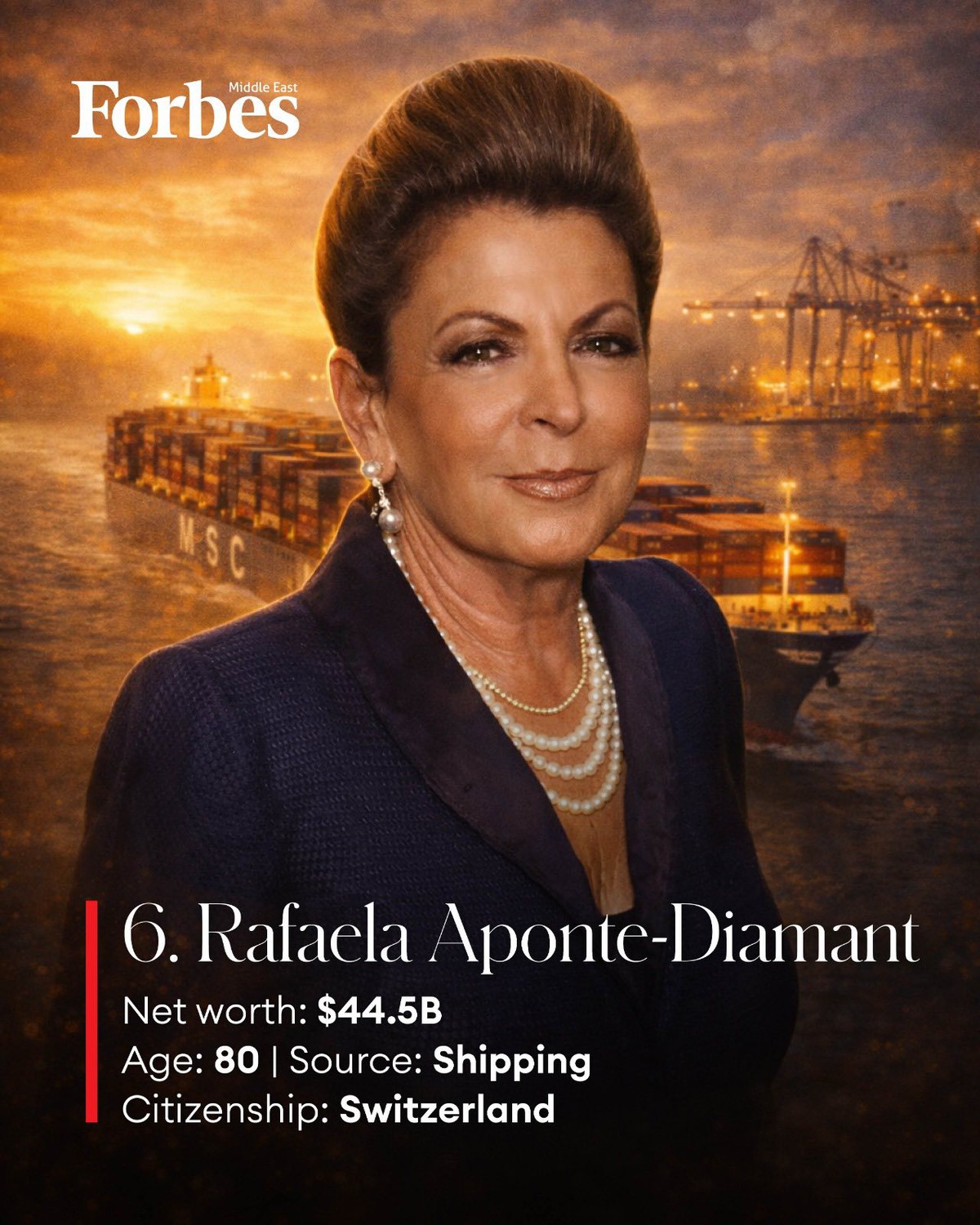 Bà Rafaela Aponte-Diamant, doanh nhân Thụy Sĩ và cũng là người phụ nữ tự thân duy nhất trong top 10. Bà cùng chồng là doanh nhân Gianluigi Aponte sáng lập Mediterranean Shipping Company (MSC) từ khoản vay 200.000 USD để mua con tàu đầu tiên năm 1970. Từ khởi đầu nhỏ đó, MSC đã phát triển thành một trong những tập đoàn vận tải biển lớn nhất thế giới. Tài sản của bà hiện là 44,5 tỷ USD.
