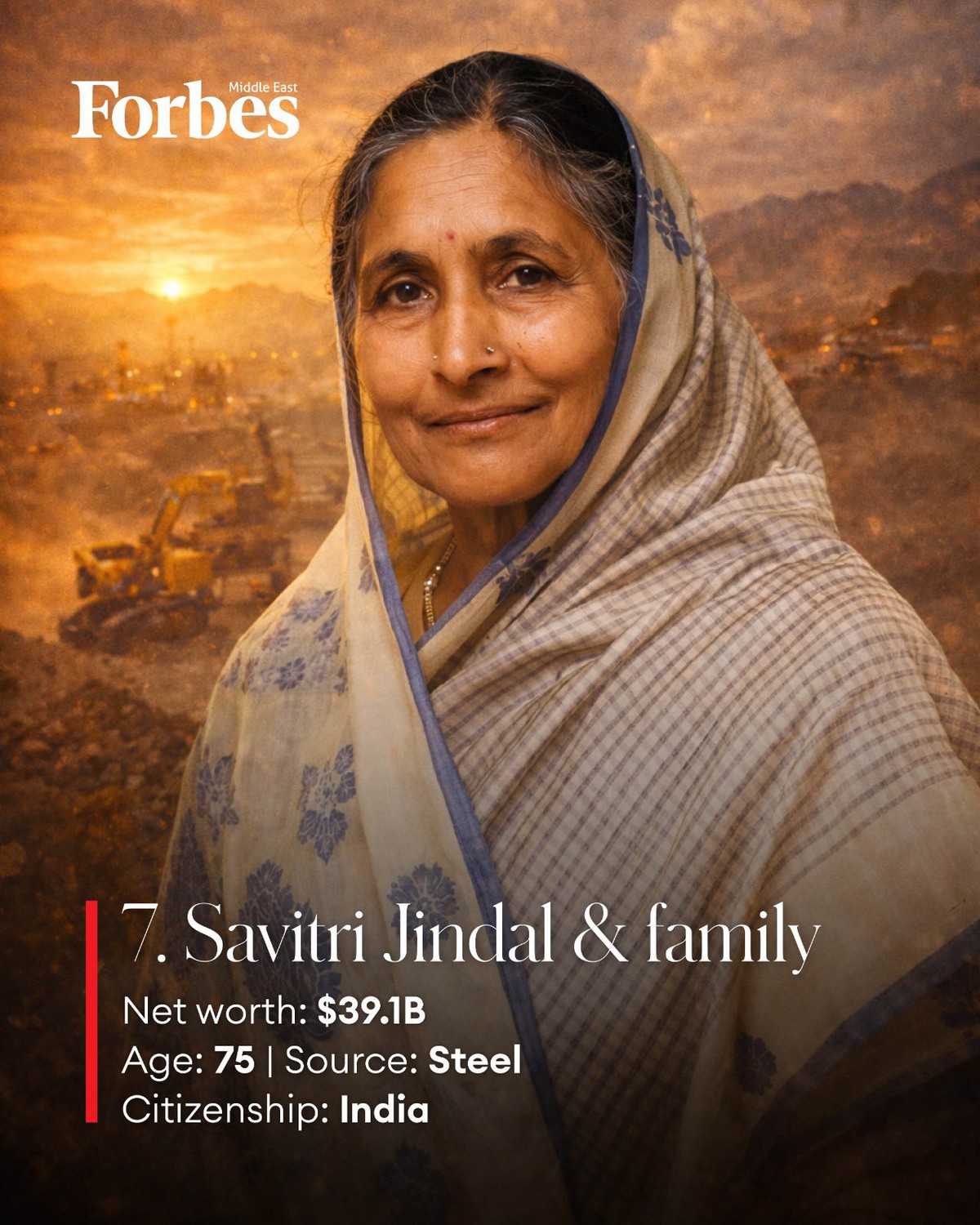 Bà Savitri Jindal (75 tuổi), người phụ nữ giàu nhất Ấn Độ với tài sản 39,1 tỷ USD. Jindal lần đầu lọt top 10 phụ nữ giàu nhất thế giới năm 2024. Tài sản của bà đến từ Jindal Group - tập đoàn hoạt động trong các lĩnh vực thép, năng lượng, xi măng và hạ tầng. Sau khi chồng bà, nhà sáng lập O.P. Jindal, qua đời năm 2005, 4 người con trai của bà tiếp quản và điều hành các mảng kinh doanh của tập đoàn.