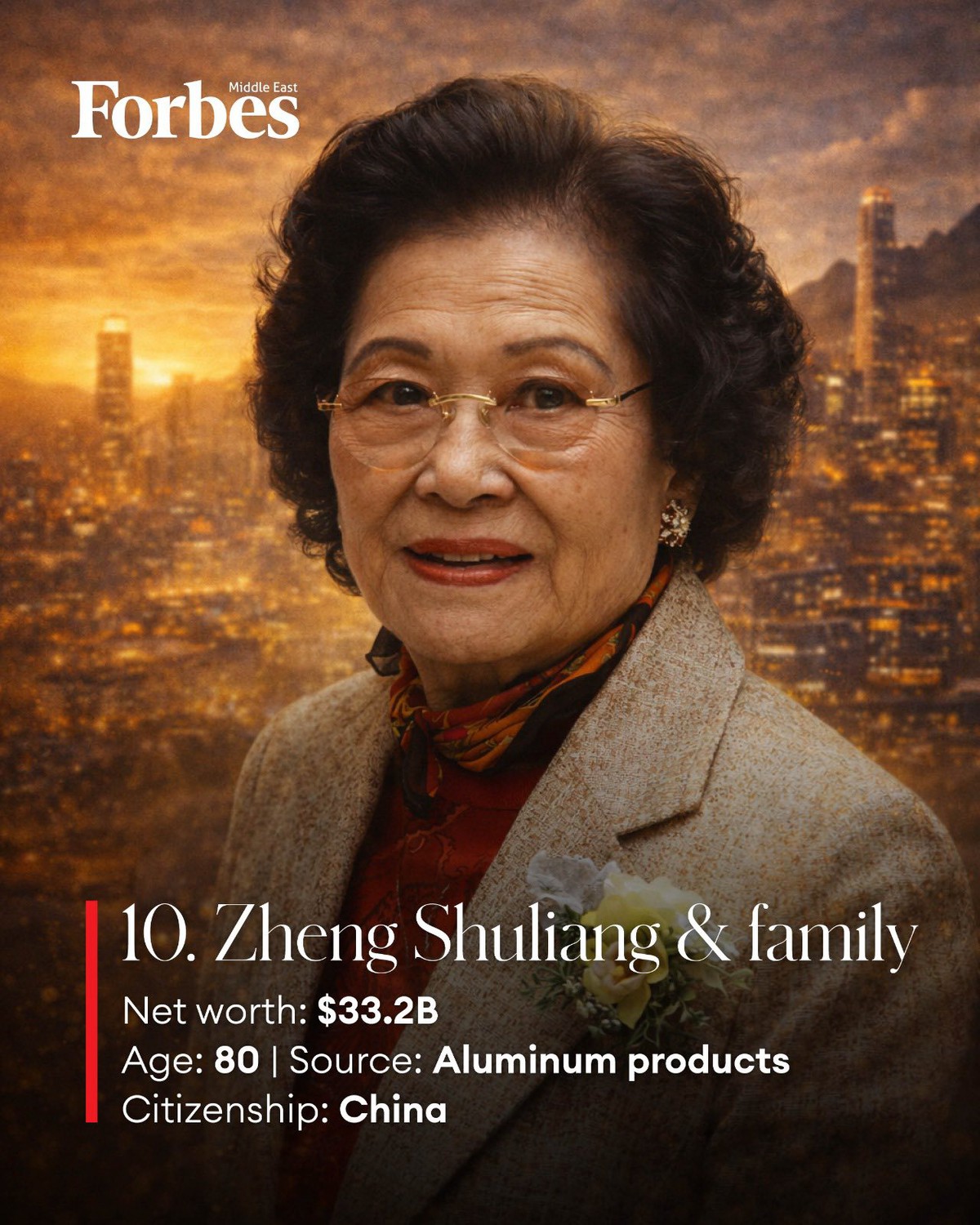 Là 1 trong số 2 người phụ nữ châu Á trong top 10, bà Zheng hiện giữ vị trí Phó chủ tịch China Hongqiao Group (Trung Quốc) - một trong những nhà sản xuất nhôm lớn nhất thế giới. Công ty do chồng bà thành lập năm 1994. Hiện doanh nghiệp do con trai bà - Zhang Bo điều hành với vai trò CEO kiêm Chủ tịch. Doanh nghiệp này đạt doanh thu hơn 21 tỷ USD năm 2024, hiện có hơn 52.000 nhân viên. Tài sản của bà là 33,2 tỷ USD.