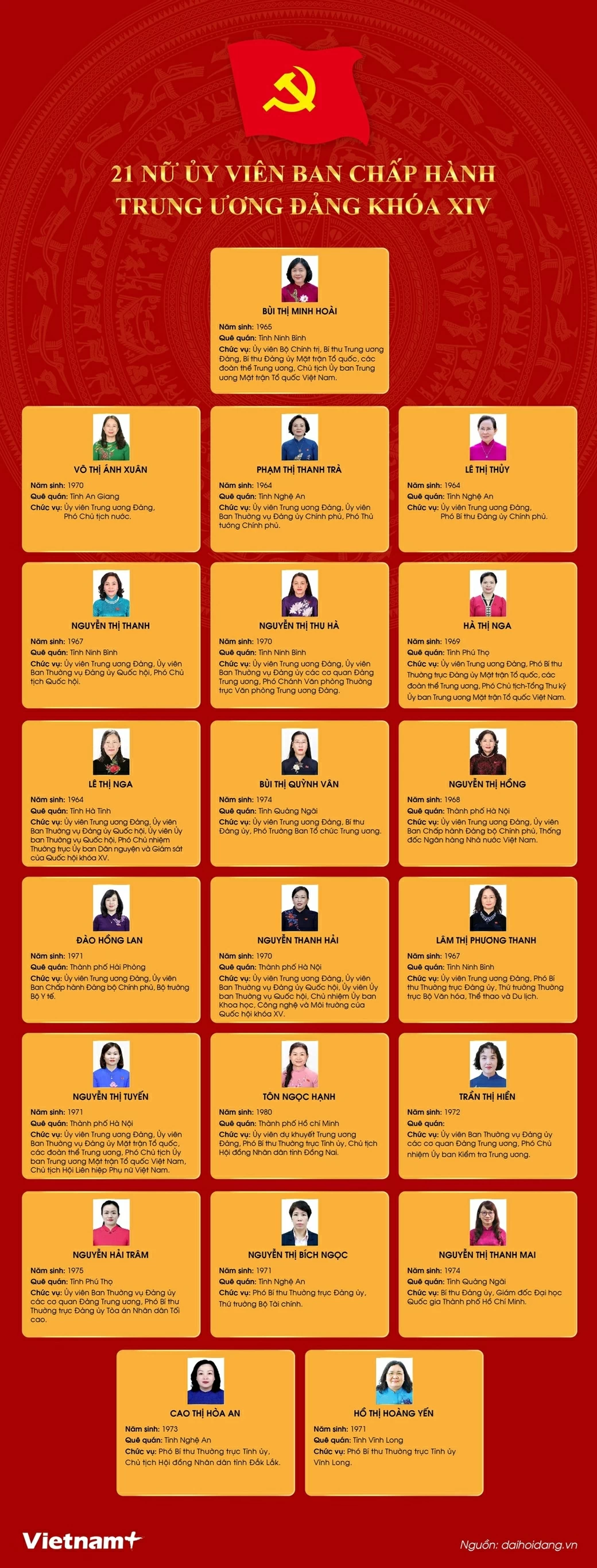 Nguồn TG&VN : https://baoquocte.vn/chan-dung-21-nu-uy-vien-ban-chap-hanh-trung-uong-dang-khoa-xiv-351105.html