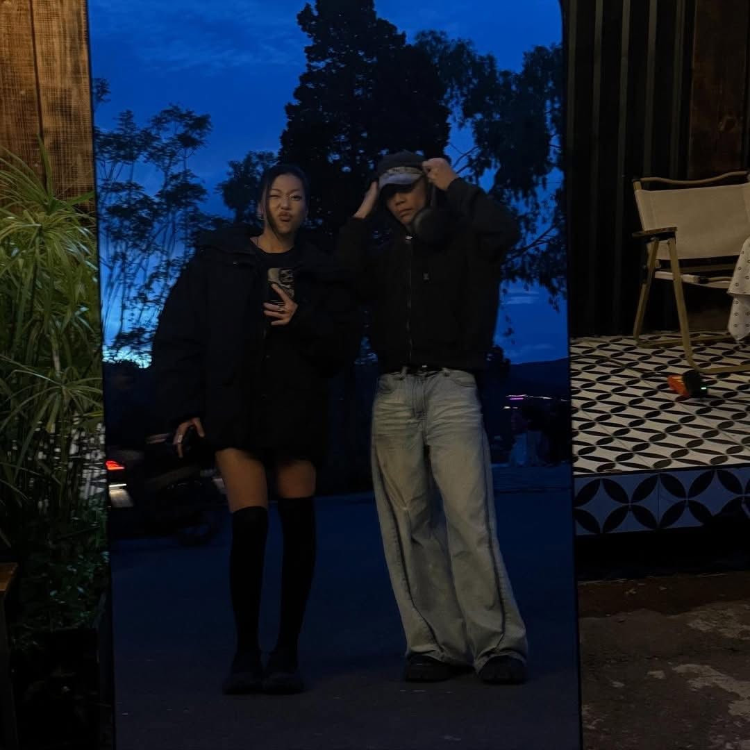 Một bức ảnh khác là ảnh chụp toàn thân trước gương, cho thấy cả hai đứng cạnh nhau với phong cách thời trang đồng điệu: chất lừ, bụi bặm và mang đậm hơi thở đường phố. Cô gái mặc áo khoác oversized đen và tất cao cổ, trong khi MCK vẫn trung thành với chiếc quần jeans ống rộng đặc trưng và áo khoác tối màu. (Ảnh: IG @rpt.mckeyyyyy)
