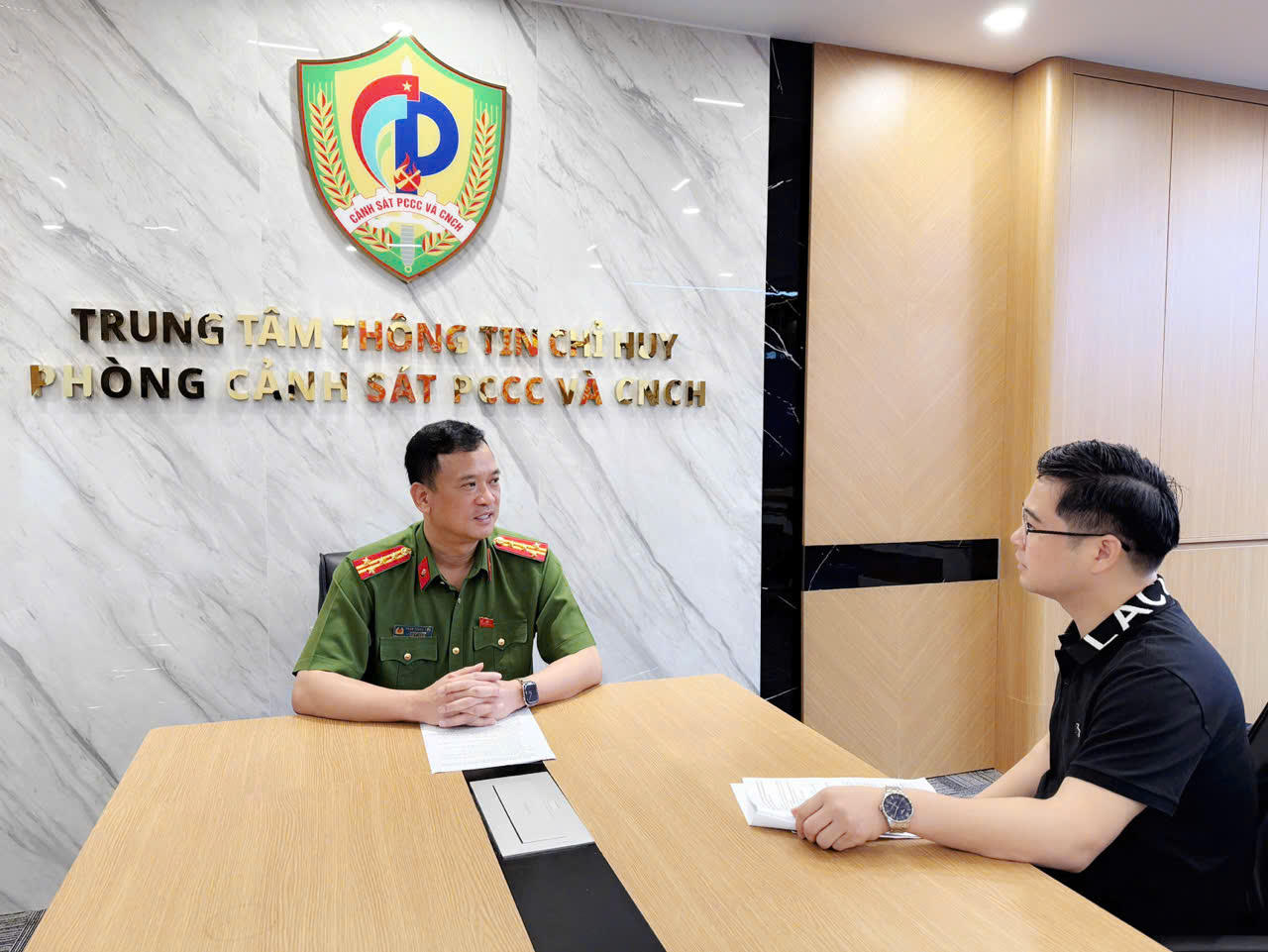 Đại tá Phạm Trung Hiếu – Trưởng Phòng Cảnh sát PCCC và CNCH Công an TP Hà Nội trao đổi với phóng viên Báo Pháp luật Việt Nam về công tác phòng ngừa cháy, nổ trong giai đoạn phát triển mới.