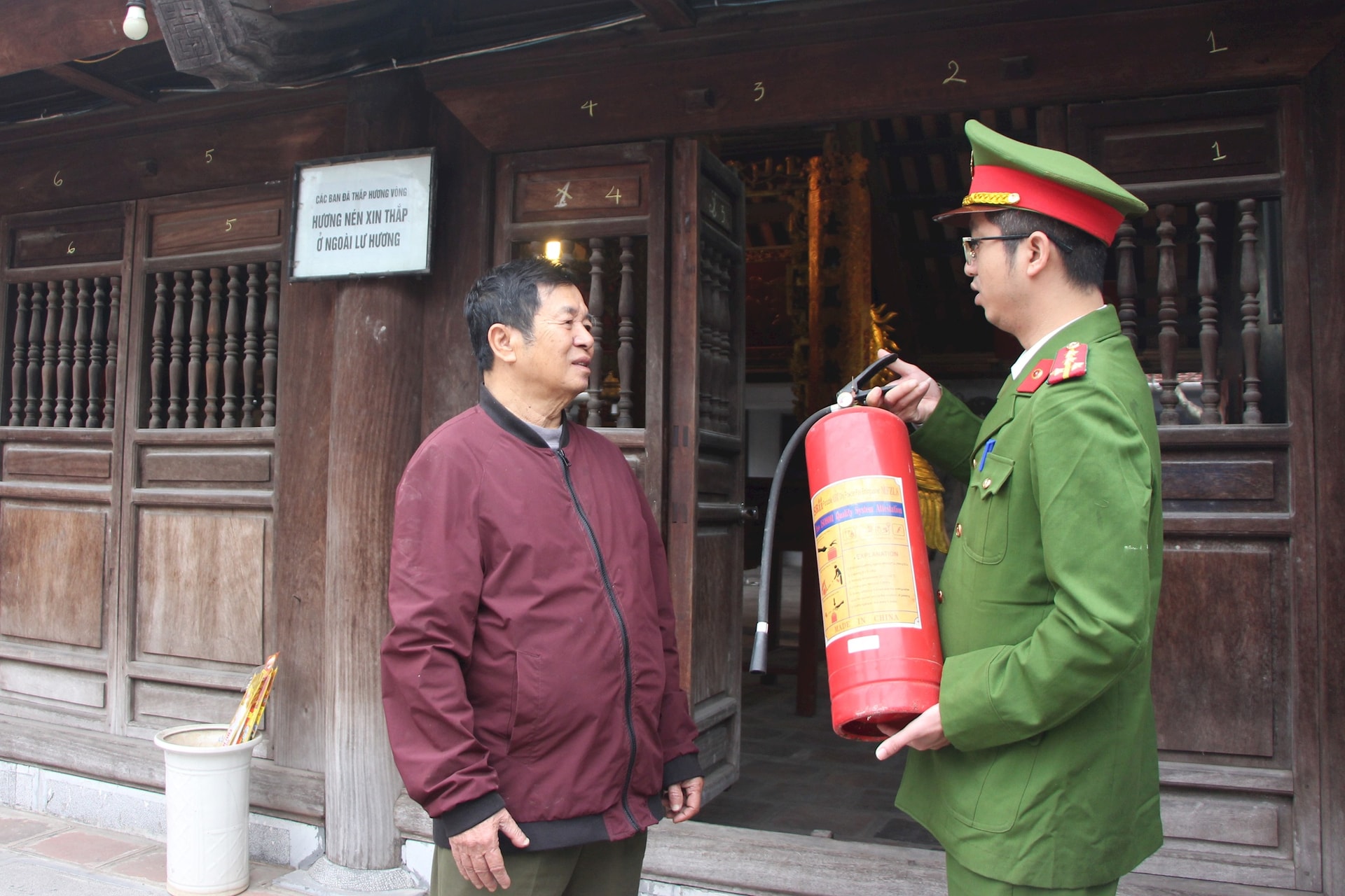 Thủ từ Đình Ngọc Hà (phường Ba Đình) và Cán bộ Đội Chữa cháy và cứu nạn, cứu hộ khu vực số 8 kiểm tra phương tiện chữa cháy tại chỗ. Ảnh: MH