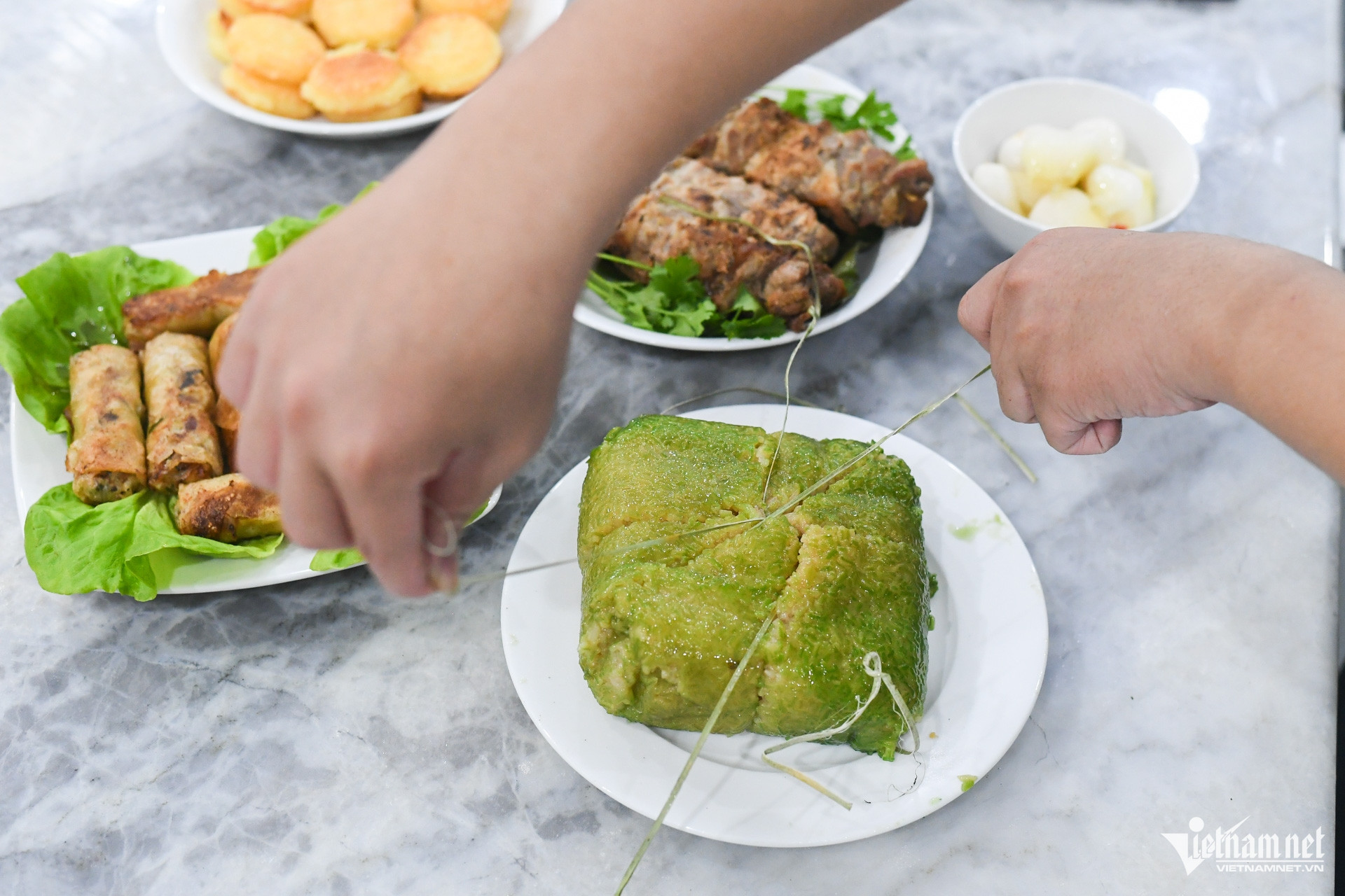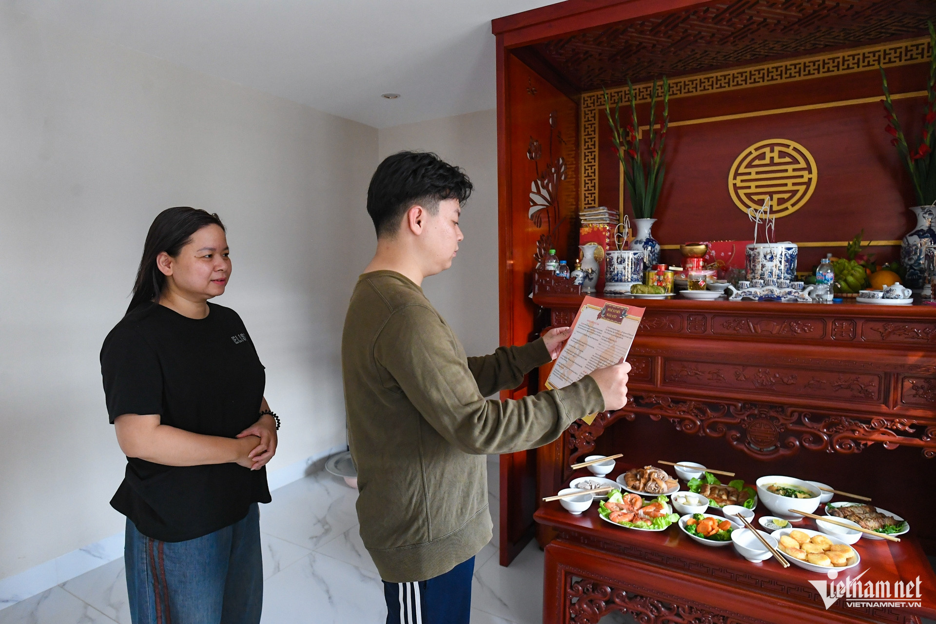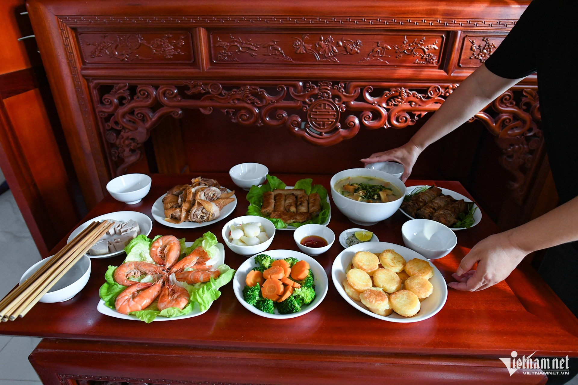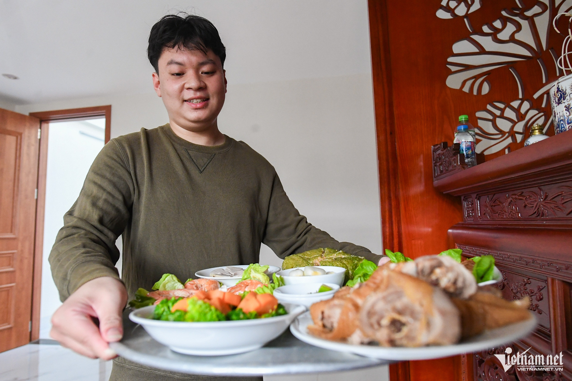 10h30 trưa 29 tết Bính Ngọ, cơm cúng đã được bày biện tinh tươm, mâm cơm gồm những món truyền thống như bánh chưng, thịt quay, canh măng... Chàng chai 21 tuổi thay một chiếc áo dài tay, cầm tờ sớ tất niên để khấn mời tổ tiên về ăn Tết cùng gia đình.