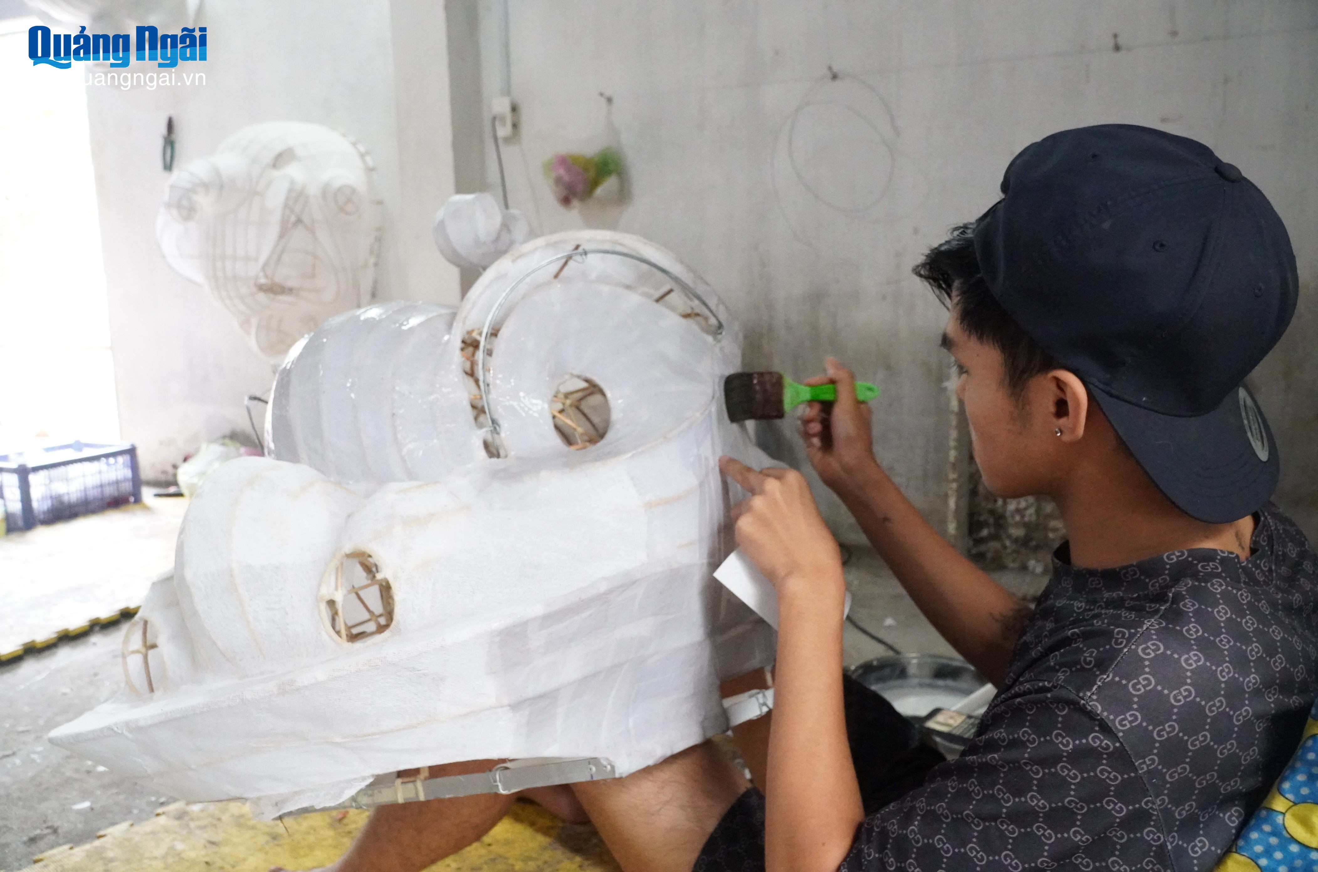 Những ngày đầu tháng 8 âm lịch, cơ sở sản xuất đầu lân truyền thống của anh Đinh Vũ Thiện (32 tuổi), trưởng câu lạc bộ lân sư rồng Hoàn Thiện, đường Đào Duy Từ, phường Kon Tum luôn nhộn nhịp người ra vào.