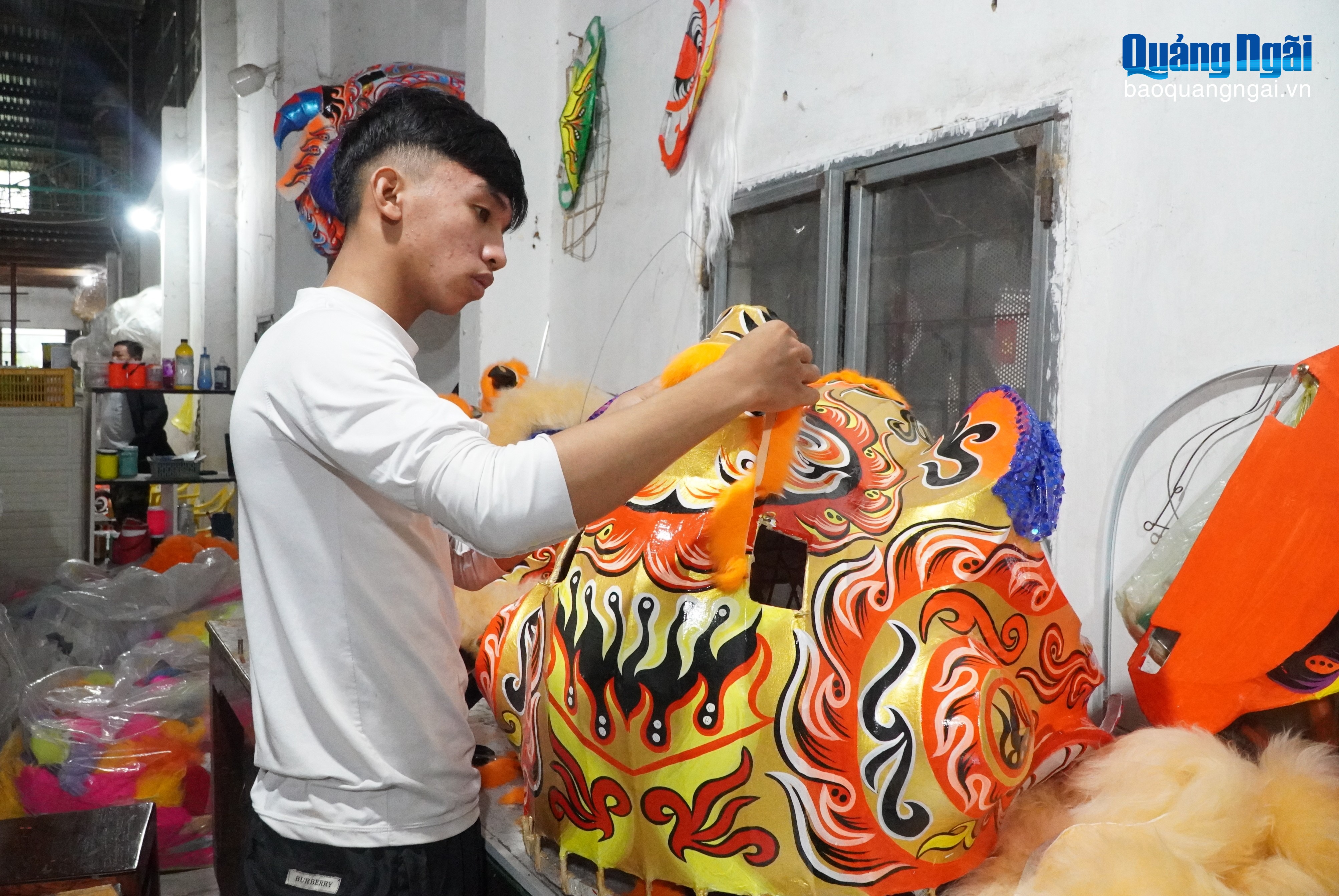 Để hoàn thiện một chiếc đầu lân, người thợ phải trải qua 4 công đoạn: tạo khung, dán giấy, tô vẽ, gắn phụ kiện. Mỗi người thợ ở cơ sở đều có năng khiếu riêng, được khuyến khích thử sức để phát huy thế mạnh, nhờ đó sản phẩm vừa tinh xảo, vừa có hồn.