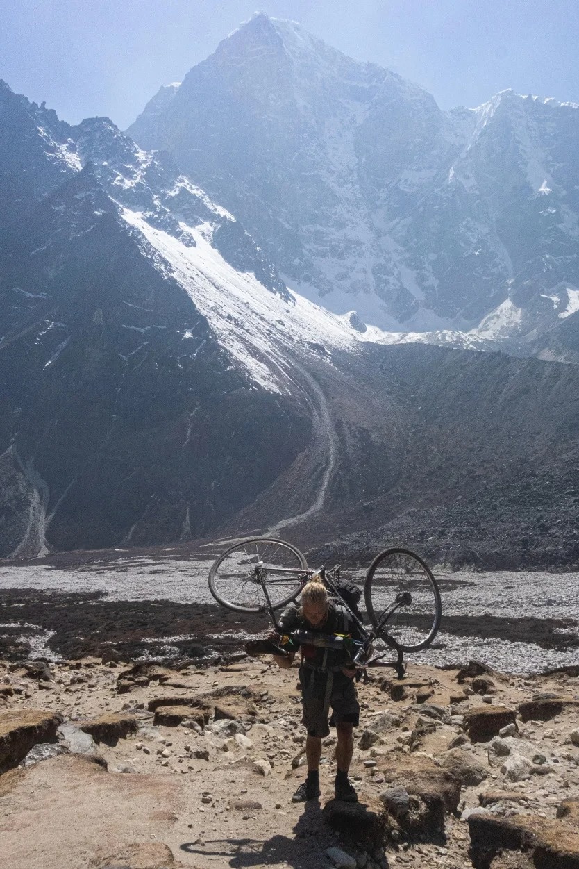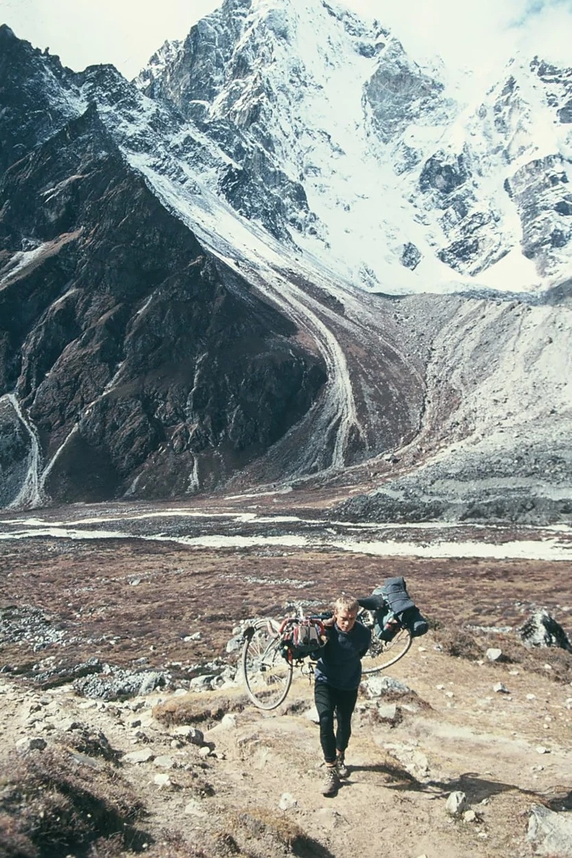 Hai bức ảnh thoạt nhìn gần như giống hệt nhau: một chàng trai trẻ đứng dưới sông băng gần trại nền Everest, vác xe đạp trên vai, ánh mắt đầy quyết tâm. Ánh sáng, góc chụp, bóng đổ tưởng như được bấm máy chỉ cách nhau vài giây.