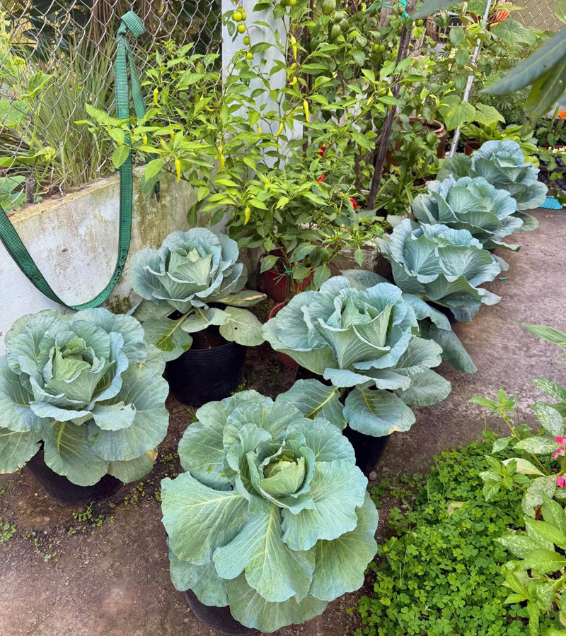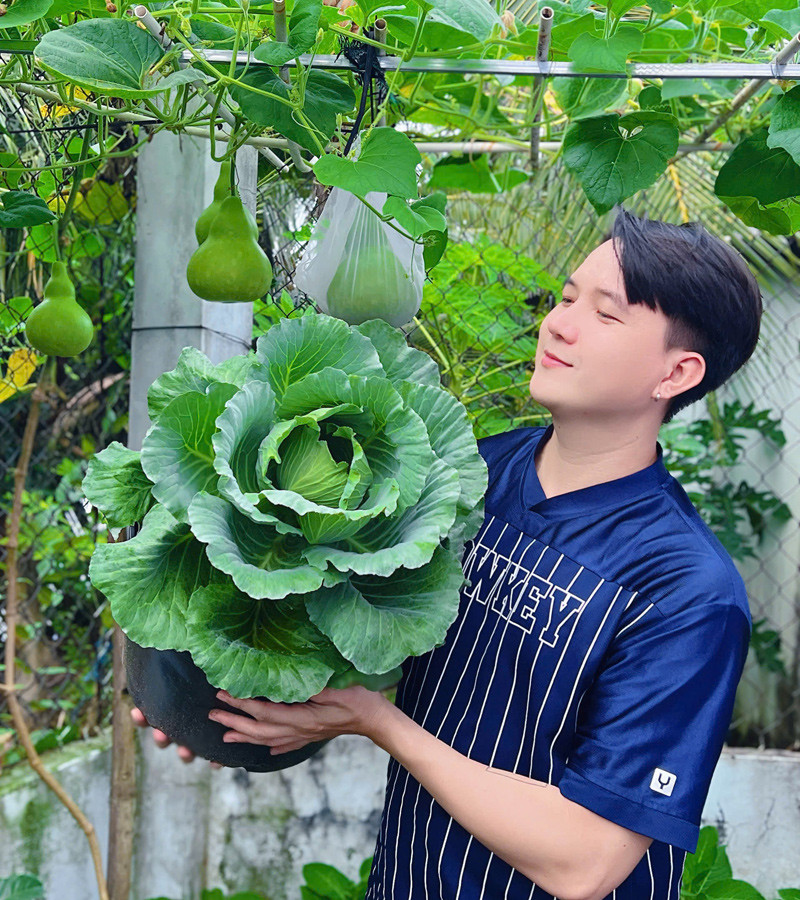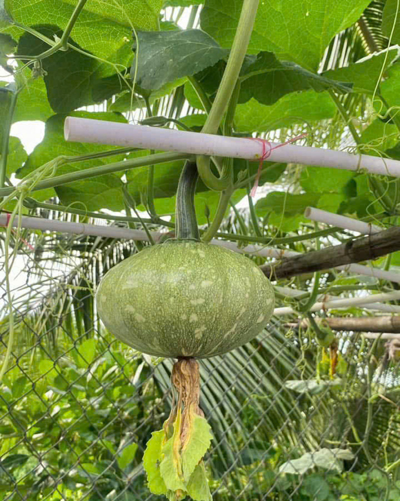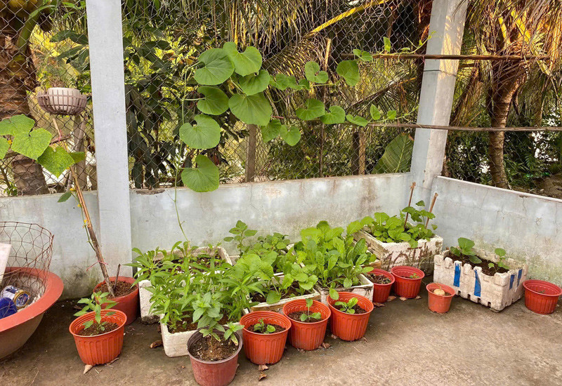 Theo thời gian, khoảng sân nhỏ của Tú được phủ xanh bởi hàng loạt rau củ, cây trái như: cải ngọt, rau muống, cải bẹ, dưa leo, dưa gang, dưa hấu, bầu, bí, mướp, cà chua...