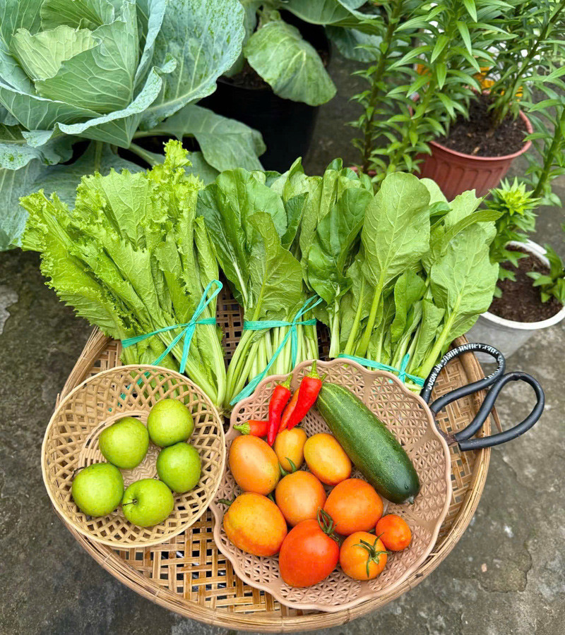 Rau quả thu hoạch được, Tú ăn không hết nên đem chia cho chị chủ trọ, hàng xóm