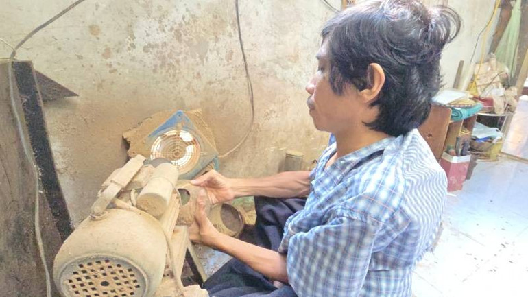 Anh Nghĩa chăm chút làm mẫu thuyền buồm mi-ni mà khách đặt. Nhìn anh cần mẫn cưa gáo dừa, rồi đưa gáo vào máy tỉa tót lại, rồi đánh bóng gáo dừa để phun nước sơn lên mới hiểu sự nhẫn nại của người thợ tàn nhưng không phế.