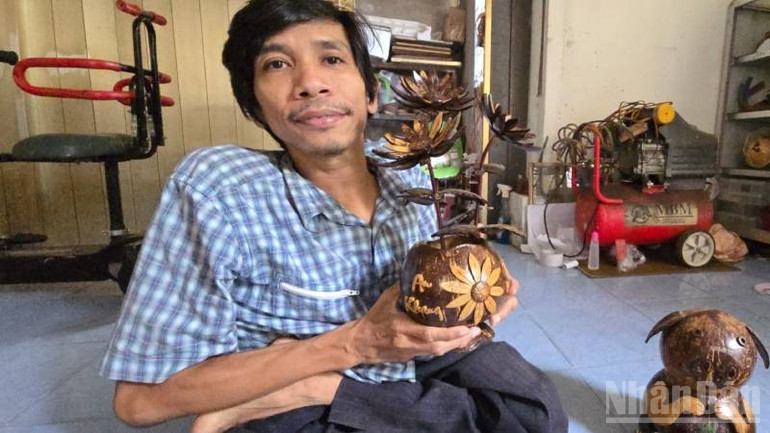 Bên trong là căn phòng nhỏ chất đầy gáo dừa, anh Quý Nghĩa với thân hình gầy guộc, hai chân teo quắt, chăm chút cầm gáo cặm cụi cưa đục, chà nhám, đánh bóng xong lắp ráp chúng thành những hình thú, bông hoa, thuyền, móc khóa, tranh thư pháp, tranh phong cảnh…