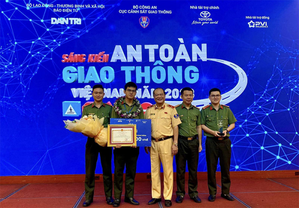 Trung úy Phạm Minh Hiếu (thứ hai, từ trái sang) nhận giải Nhì Sáng kiến an toàn giao thông Việt Nam năm 2023.