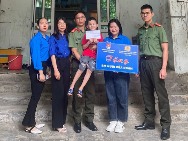 Trung úy Phạm Minh Hiếu (bìa phải) cùng cán bộ Chi đoàn tặng quà trong chương trình “Em nuôi của Đoàn”...