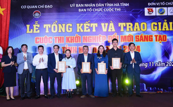 Trung úy Phạm Minh Hiếu (thứ hai từ phải sang) nhận giải thưởng Tiềm năng cuộc thi Khởi nghiệp sáng tạo tỉnh Hà Tĩnh năm 2024.