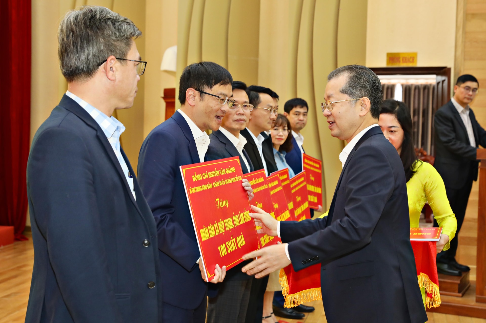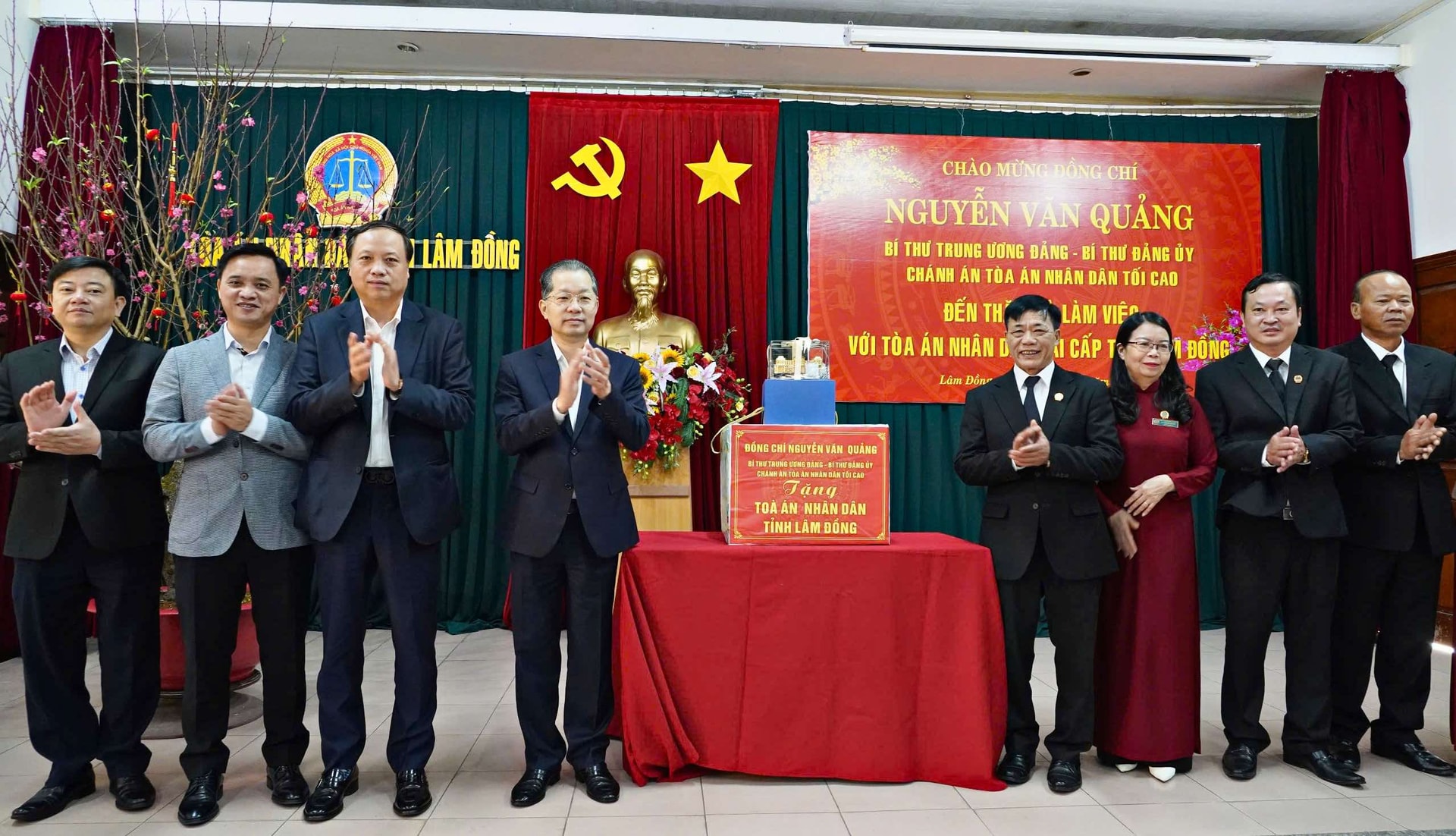 Đồng chí Nguyễn Văn Quảng, Chánh án TAND Tối cao trao phần quà Tết nhân dân các xã, phường trên địa bàn tỉnh Lâm Đồng. Trong ảnh, 8 lãnh đạo các xã, phường đại diện nhận quà Tết