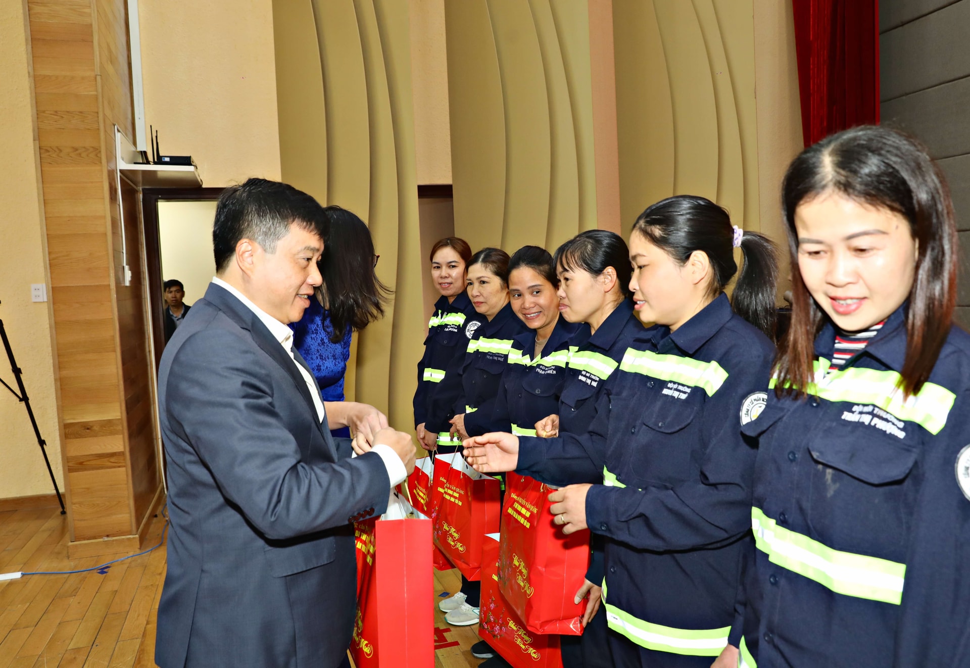 Các đồng chí: Nguyễn Văn Quảng, Bí thư Trung ương Đảng, Chánh án TAND Tối cao; Y Thành Hà Niê Kđăm, UVBCHTW Đảng, Bí thư Tỉnh ủy, Trưởng Đoàn ĐBQH tỉnh trao quà cho công nhân lao động nghèo của Công ty Cổ phần dịch vụ đô thị Đà Lạt