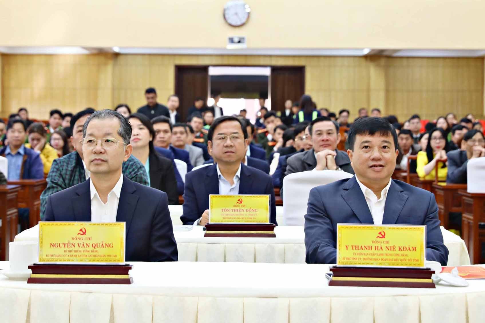 Đồng chí Nguyễn Văn Quảng, Bí thư Trung ương Đảng, Chánh án TAND Tối cao và đồng chí Y Thanh Hà Niê Kđăm, Ủy viên Ban Chấp hành Trung ương Đảng, Bí thư Tỉnh ủy, Trưởng đoàn ĐBQH tỉnh tham dự chương trình