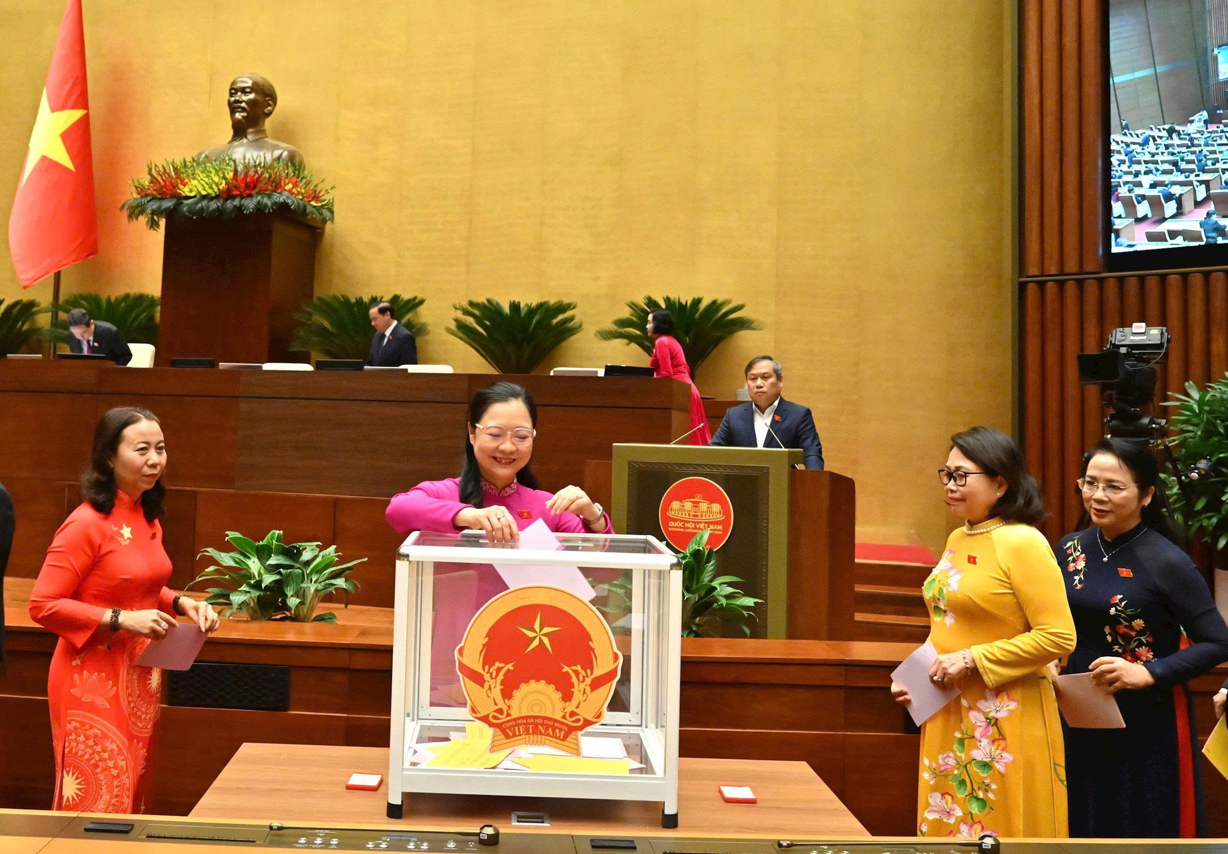 Thủ tướng Chính phủ Phạm Minh Chính, Chủ tịch Quốc hội Trần Thanh Mẫn, Thường trực Ban Bí thư Trần Cẩm Tú, Phó Chủ tịch Quốc hội Nguyễn Khắc Định bỏ phiếu bầu Chánh án Tòa án Nhân dân tối cao nhiệm kỳ 2021-2026. Ảnh: Phạm Thắng