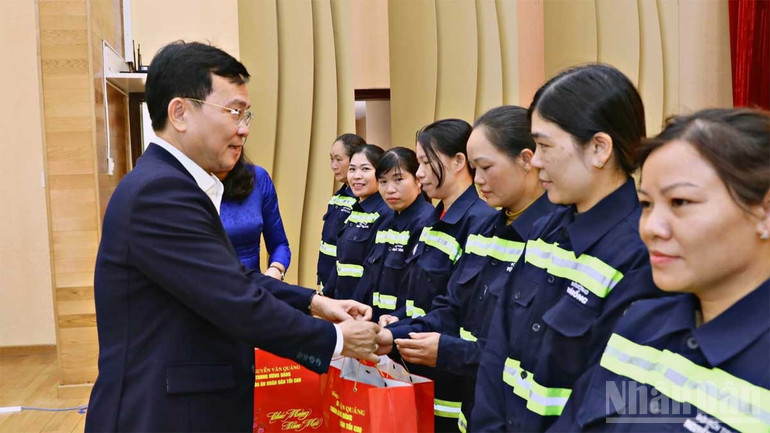 Đồng chí Hồ Văn Mười trao quà Tết tặng công nhân Công ty cổ phần dịch vụ đô thị Đà Lạt.