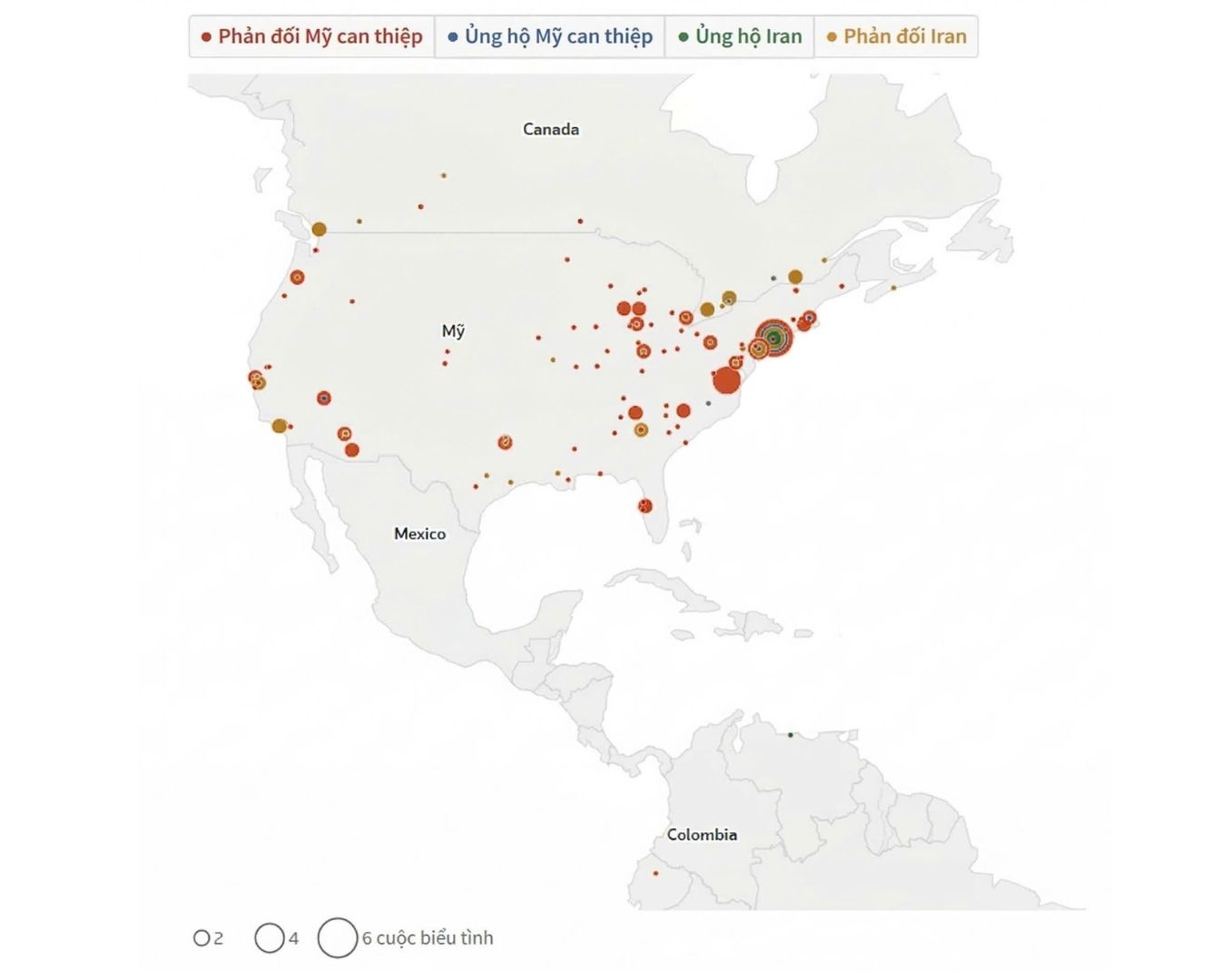 Các cuộc biểu tình liên quan đến chiến sự tại Iran tại châu Mỹ. Biểu đồ: Reuters.