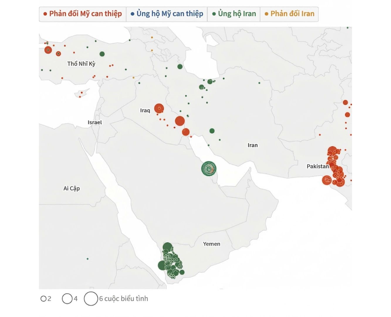 Các cuộc biểu tình liên quan đến chiến sự tại Iran tại Trung Đông. Biểu đồ: Reuters.