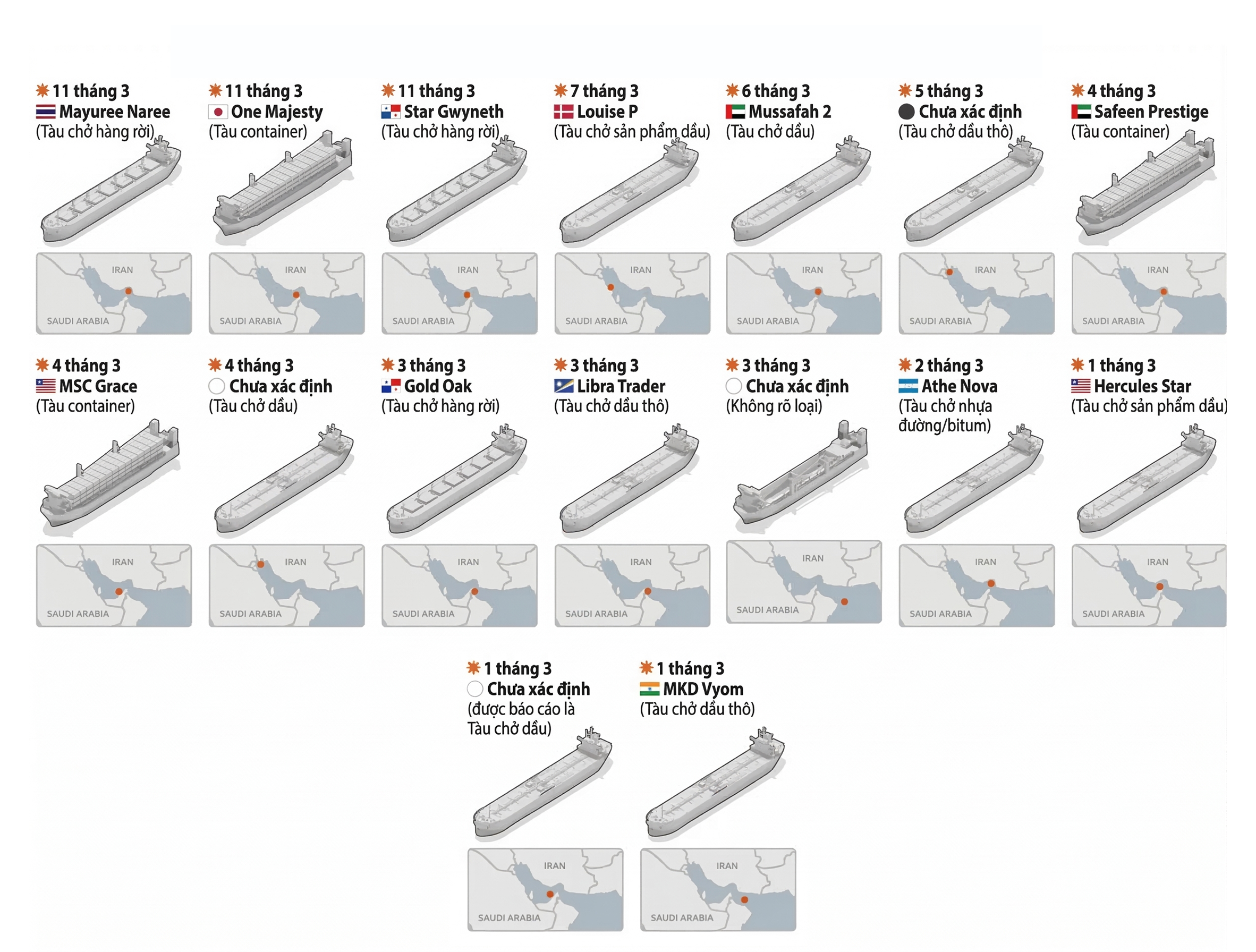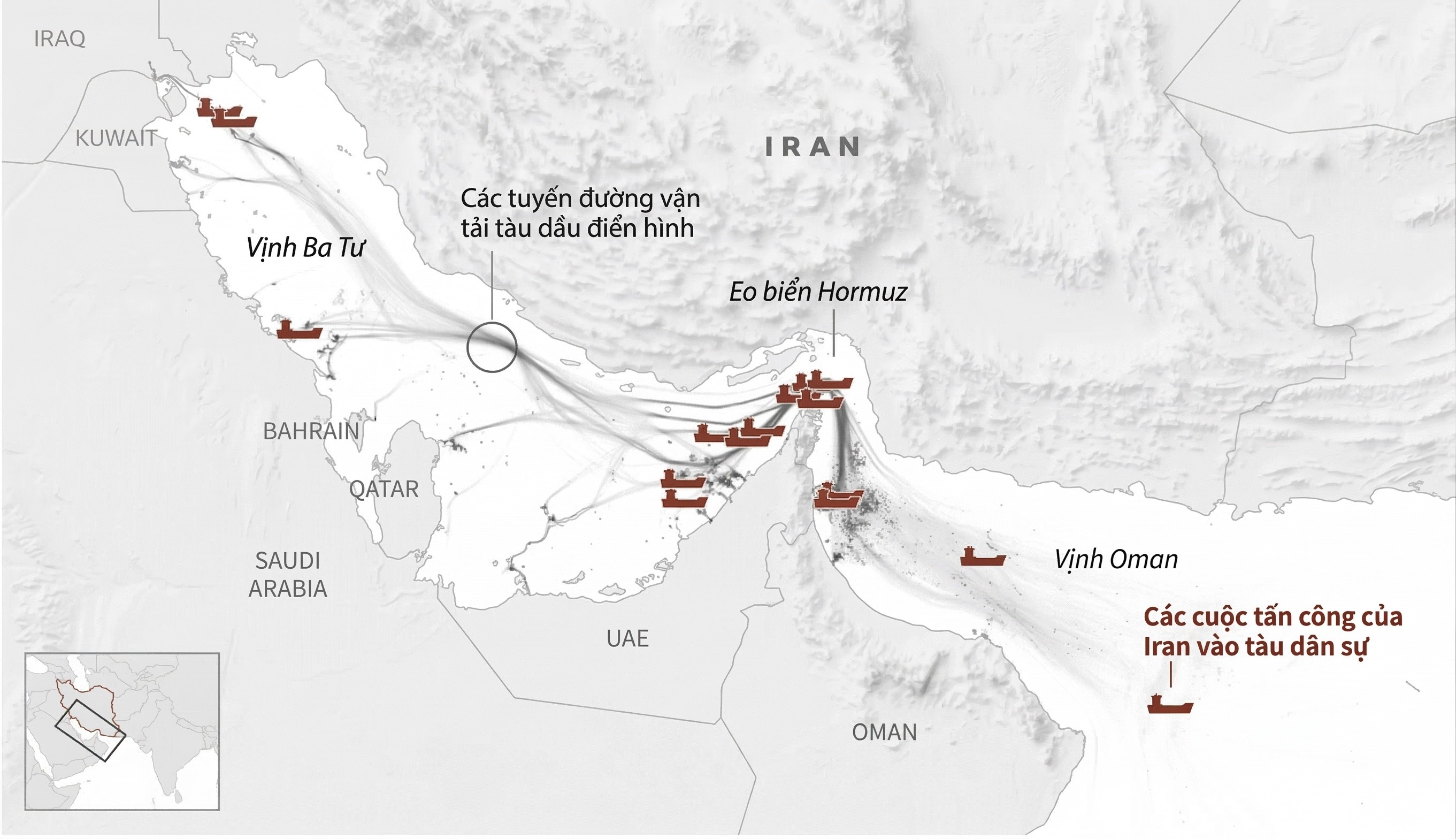 Bản đồ các cuộc tấn công vào các tàu đi qua eo biển Hormuz kể từ khi chiến sự bắt đầu. Biểu đồ: Reuters.