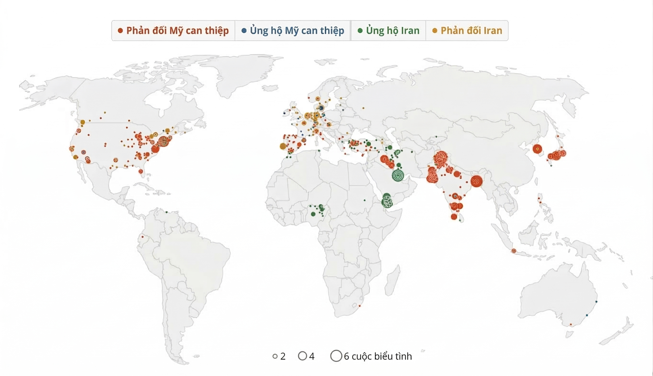 Các cuộc biểu tình liên quan đến chiến sự tại Iran trên phạm vi toàn cầu. Biểu đồ: Reuters.