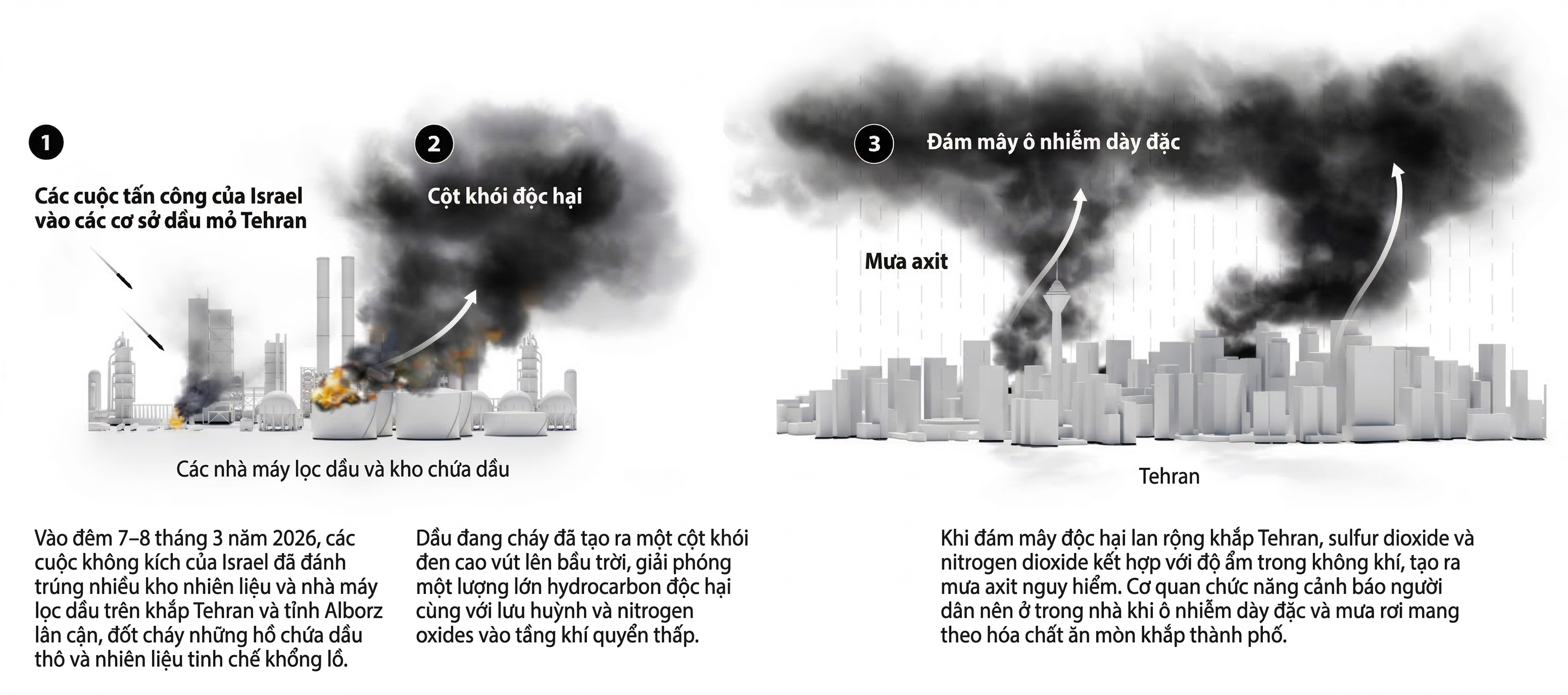 Khói dày chứa các hóa chất độc hại như hydrocarbon, sulfur dioxide và nitrogen dioxide đã bao trùm phần lớn Tehran - thành phố hơn 9 triệu dân. Chính quyền Iran khuyến cáo người dân hạn chế ra ngoài, đặc biệt là trẻ em, người cao tuổi, người mắc bệnh tim phổi và phụ nữ mang thai.