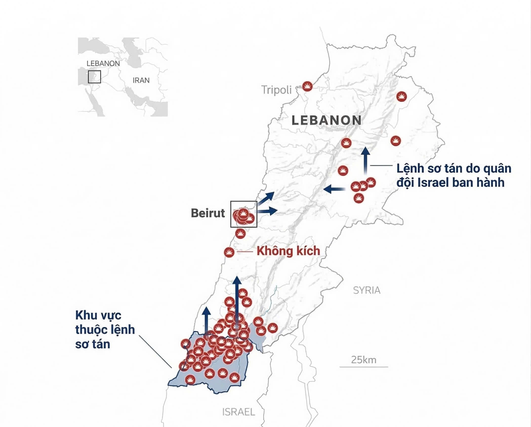 Đây là lệnh sơ tán trên diện rộng nhất mà Israel từng ban hành đối với Lebanon, khiến hàng chục nghìn người phải rời bỏ nhà cửa trước khi các đợt oanh kích biến nhiều tòa nhà thành đống đổ nát.