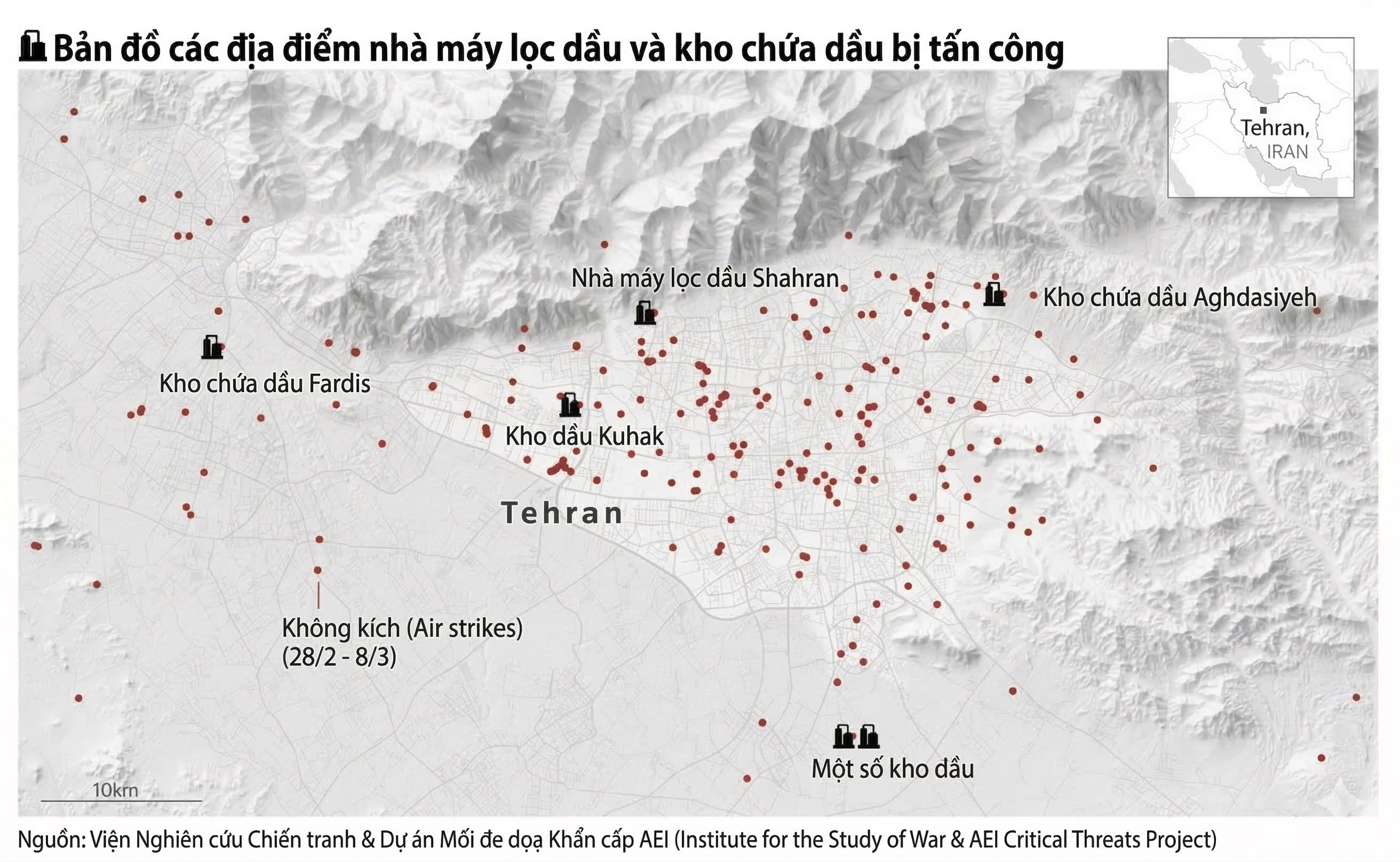 Các kho nhiên liệu và nhà máy lọc dầu quanh Tehran bốc lên những cột khói đen dày đặc sau khi Israel tuyên bố đã tấn công các cơ sở này trong đêm 7/3.