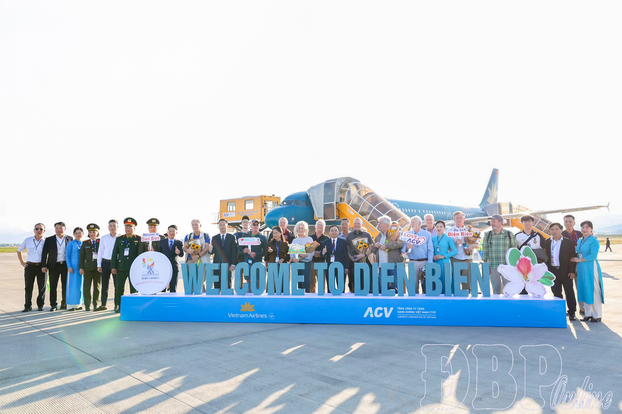 Các đại biểu chụp ảnh lưu niệm cùng du khách trên chuyến bay đầu tiên đến Điện Biên năm 2026.