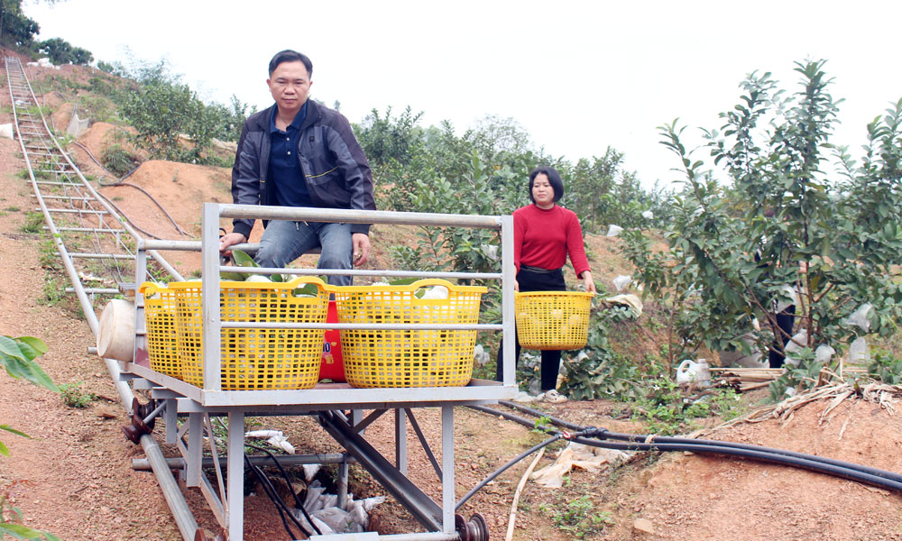 Anh Đặng Huy Phong vận chuyển ổi từ trên đồi cao xuống, đưa đi tiêu thụ.