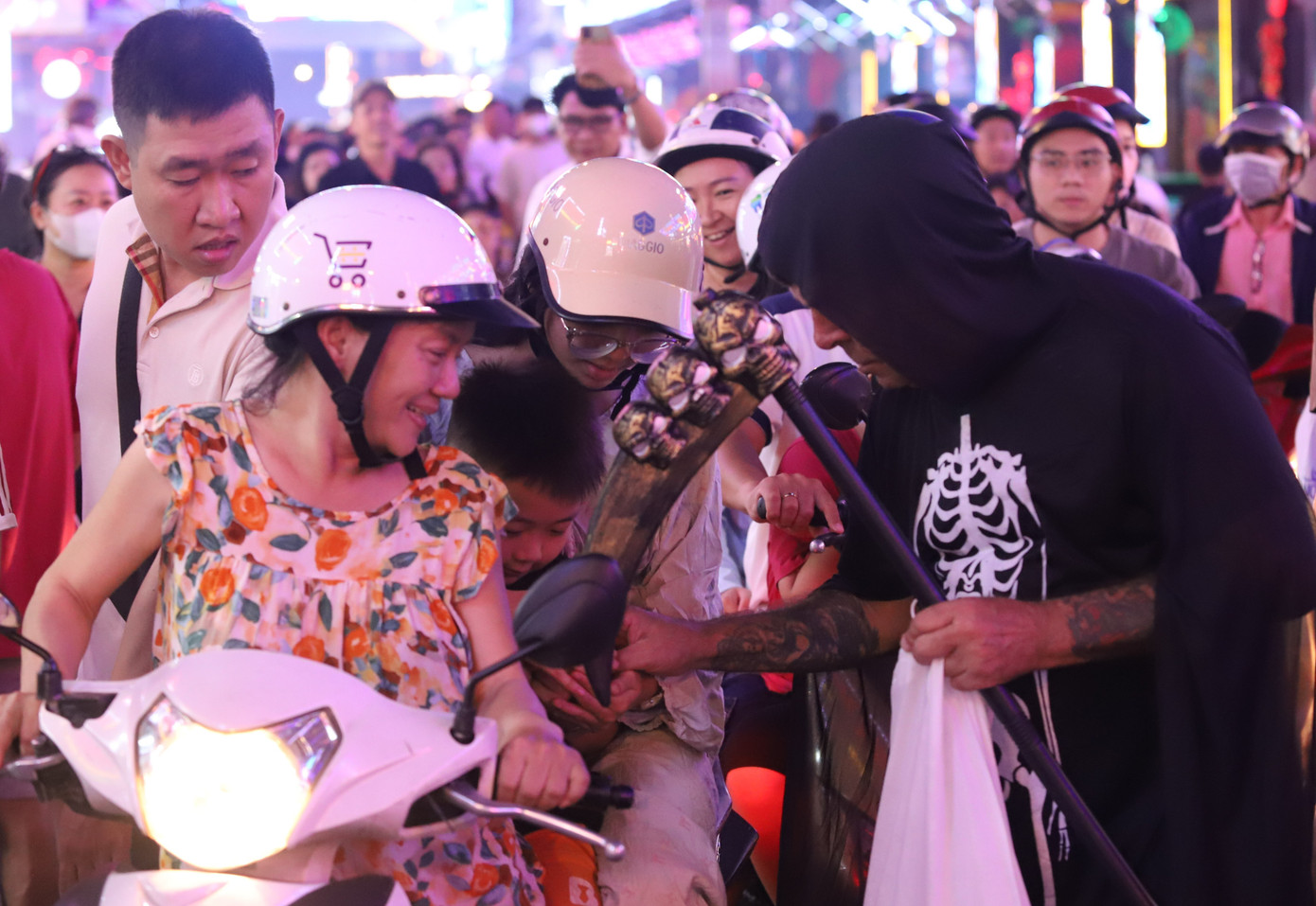 Hóa trang thành Thần Chết, người đàn ông nước ngoài mang theo túi kẹo và phân phát cho những em nhỏ tham gia lễ hội trên phố.