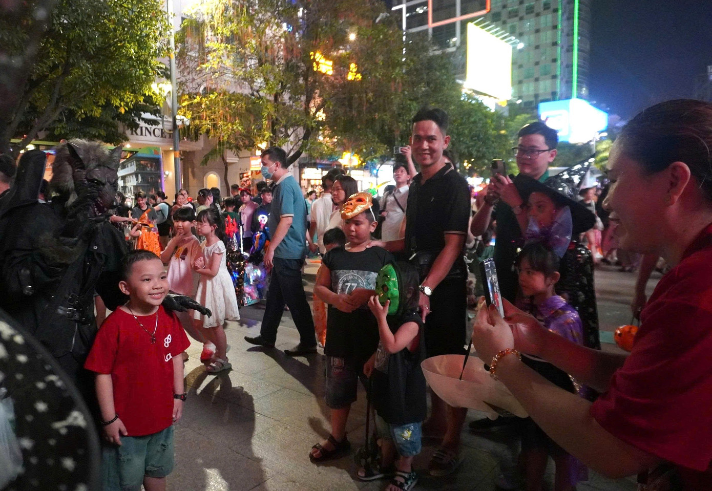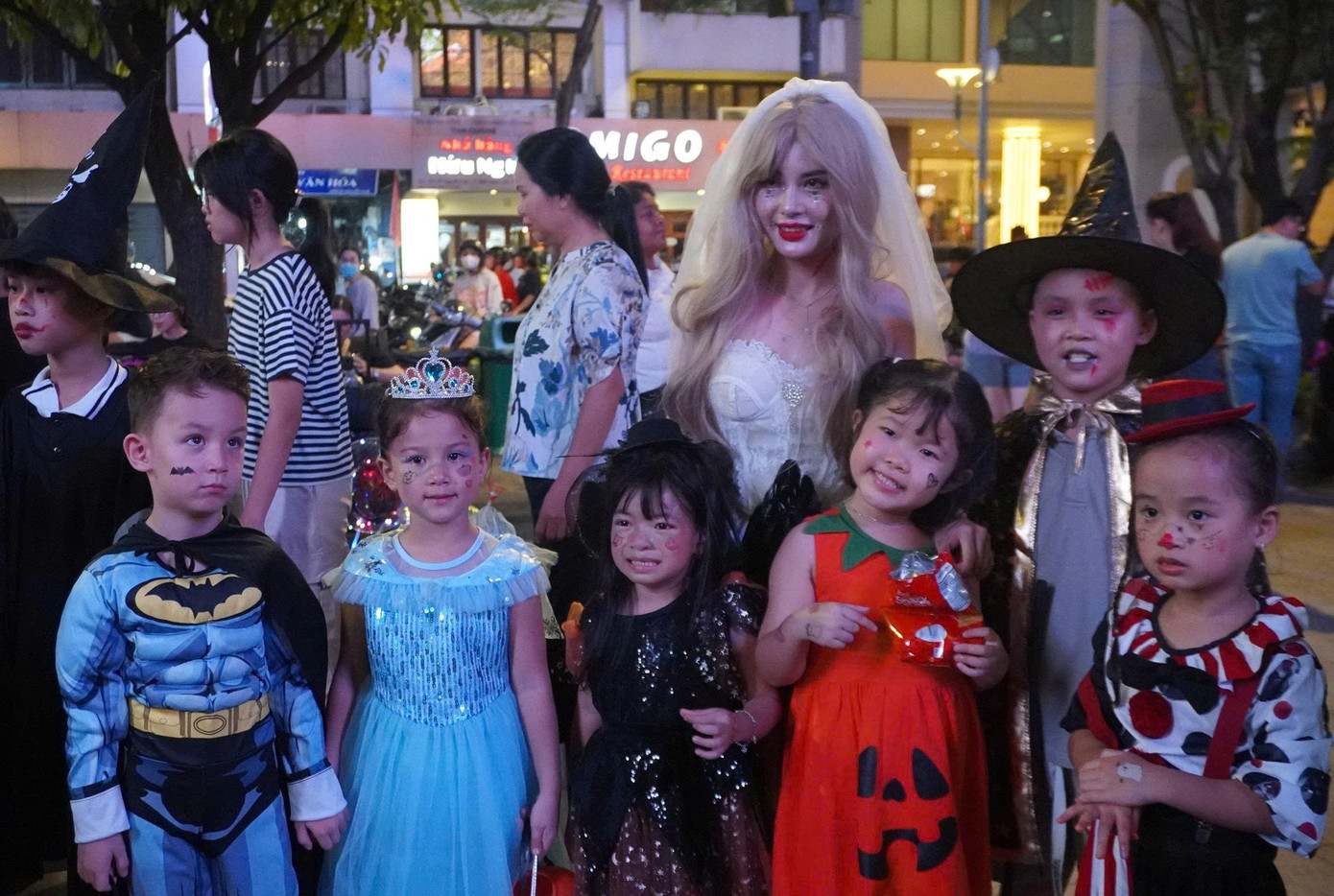 Các em nhỏ hóa trang Halloween chụp ảnh cùng một "công chúa" trên Phố đi bộ Nguyễn Huệ.