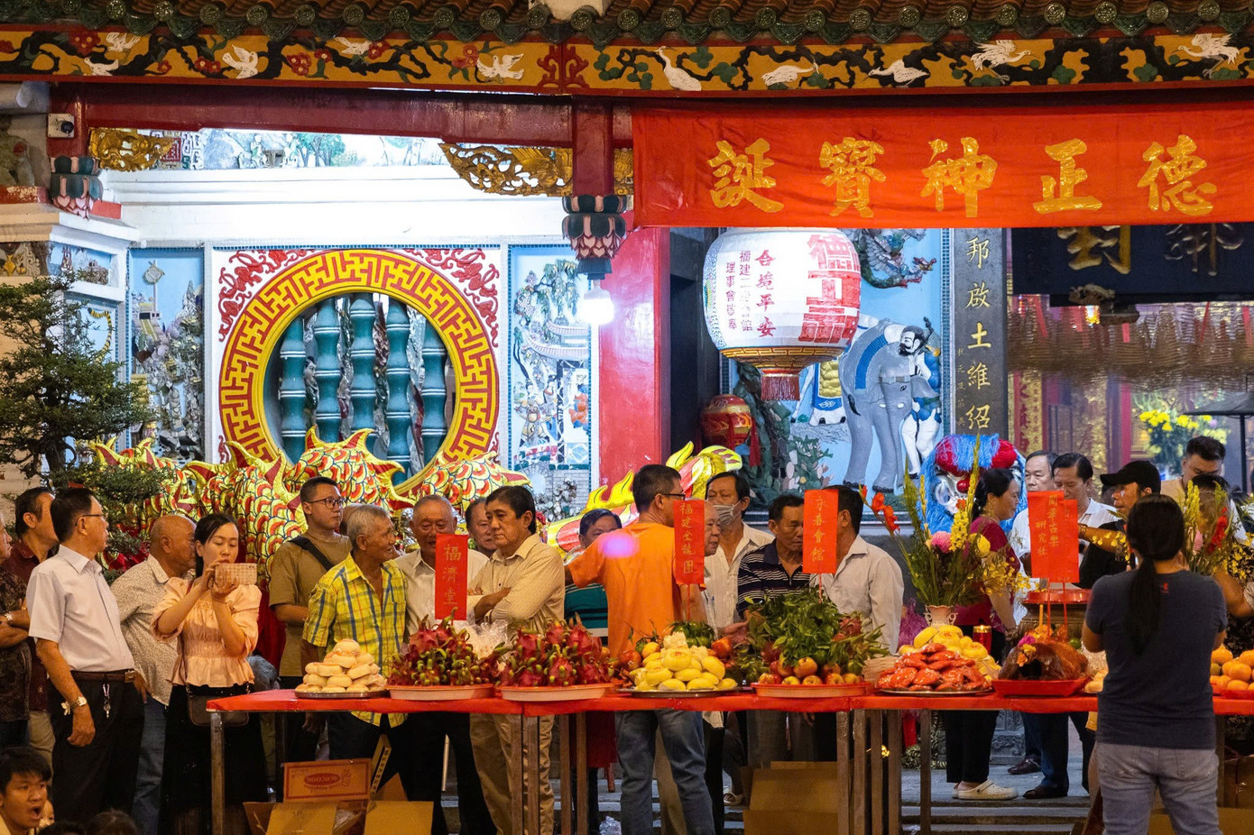 Người dân và du khách đến chùa Ông Bổn dự lễ cúng Rằm tháng Tám theo phong tục lâu đời.