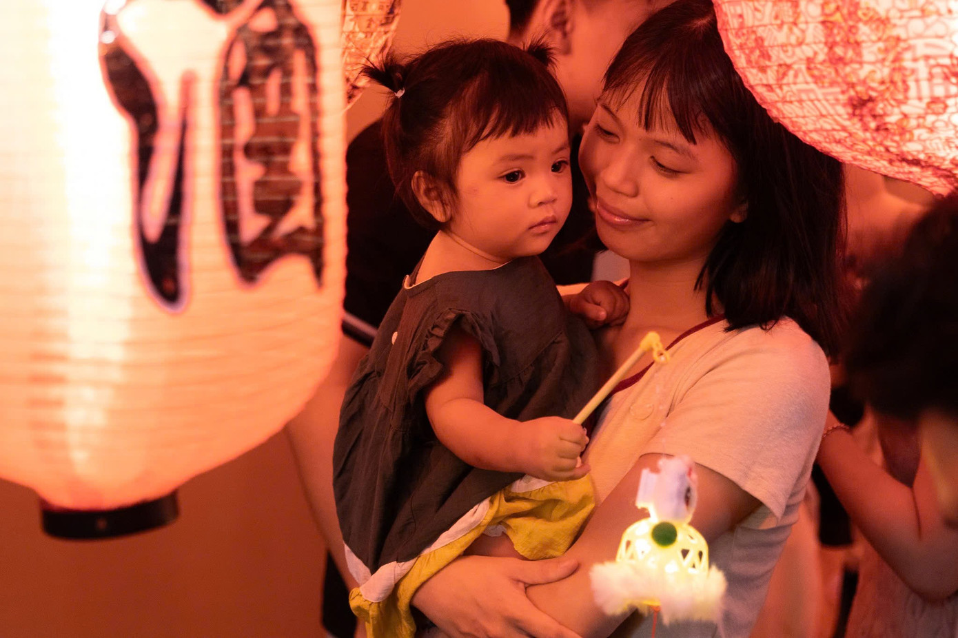 Phụ huynh đưa con nhỏ đi vui Trung thu, cùng hòa vào bầu không khí náo nhiệt.
