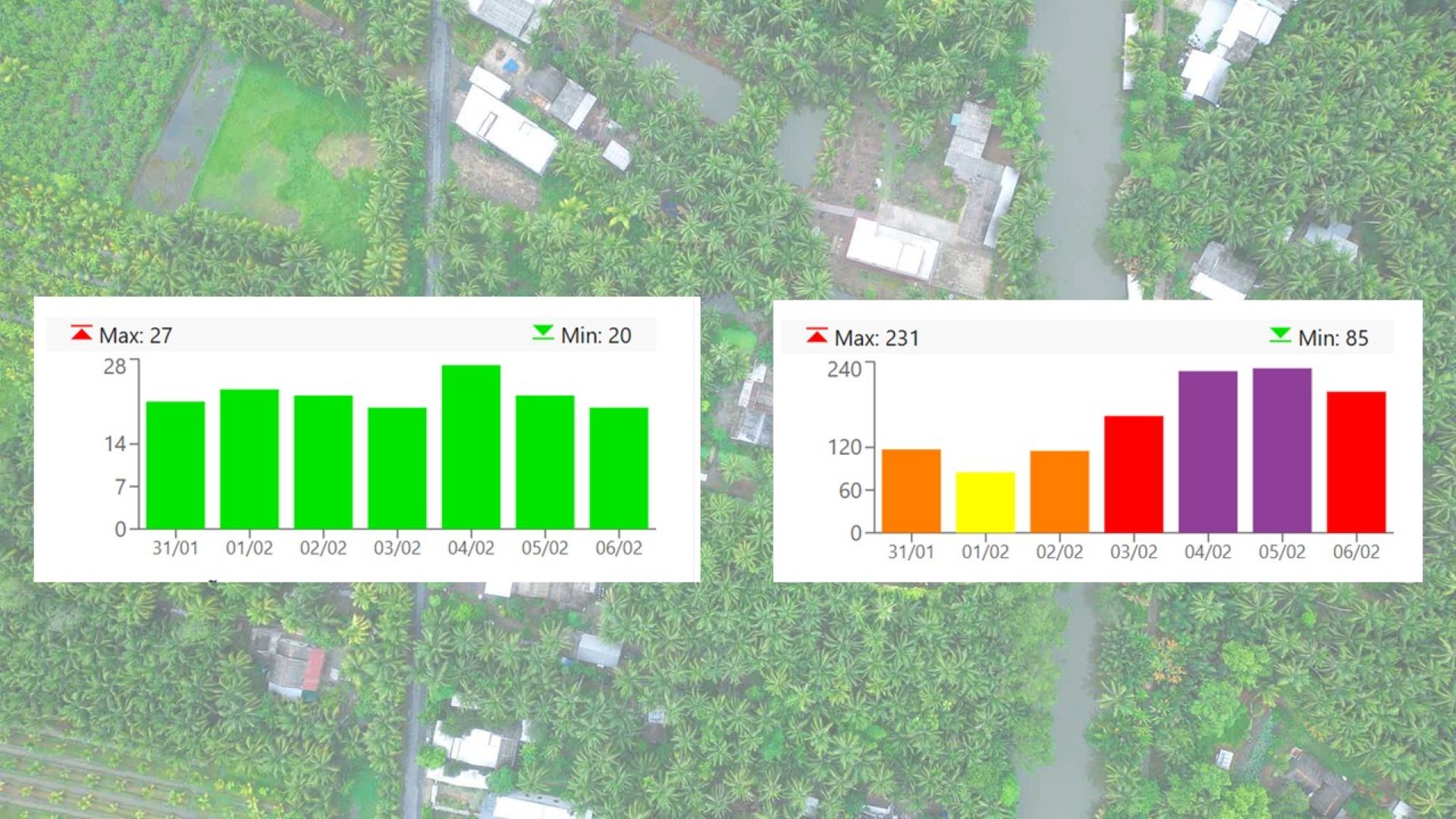 Biểu đồ biểu thị chất lượng không khí trong tuần qua tại một trạm quan trắc của tỉnh Vĩnh Long (bên trái) và Thái Nguyên (bên phải). Ảnh nền: Nguyễn Thanh Tuấn. Biểu đồ: tedp.vn