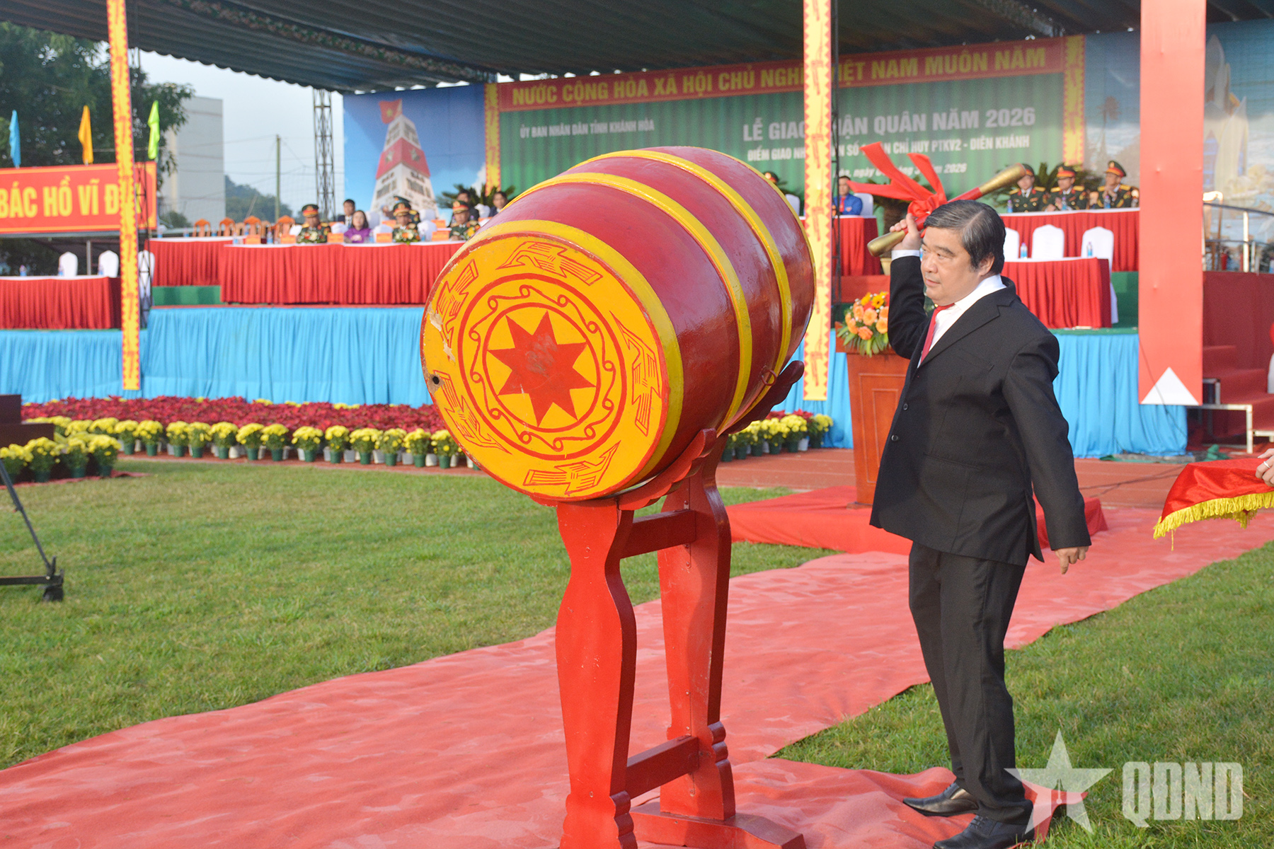 Đồng chí Tạ Hồng Quang, Bí thư Đảng ủy phường Nha Trang đánh hồi trống tại Lễ giao nhận quân năm 2026.