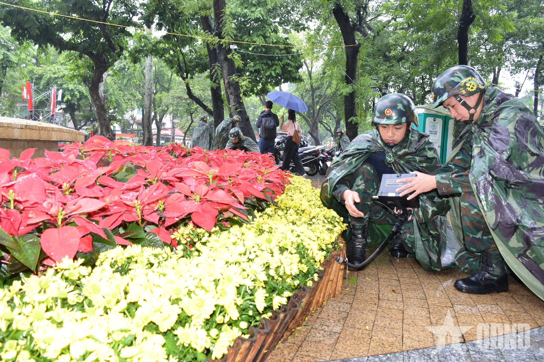 Đại úy Phạm Văn Mạnh (bên phải) hướng dẫn, chỉ đạo tổ công binh thực hiện nhiệm vụ dò mìn, vật nổ tại khu vực vườn hoa Diên Hồng (tháng 8-2025).